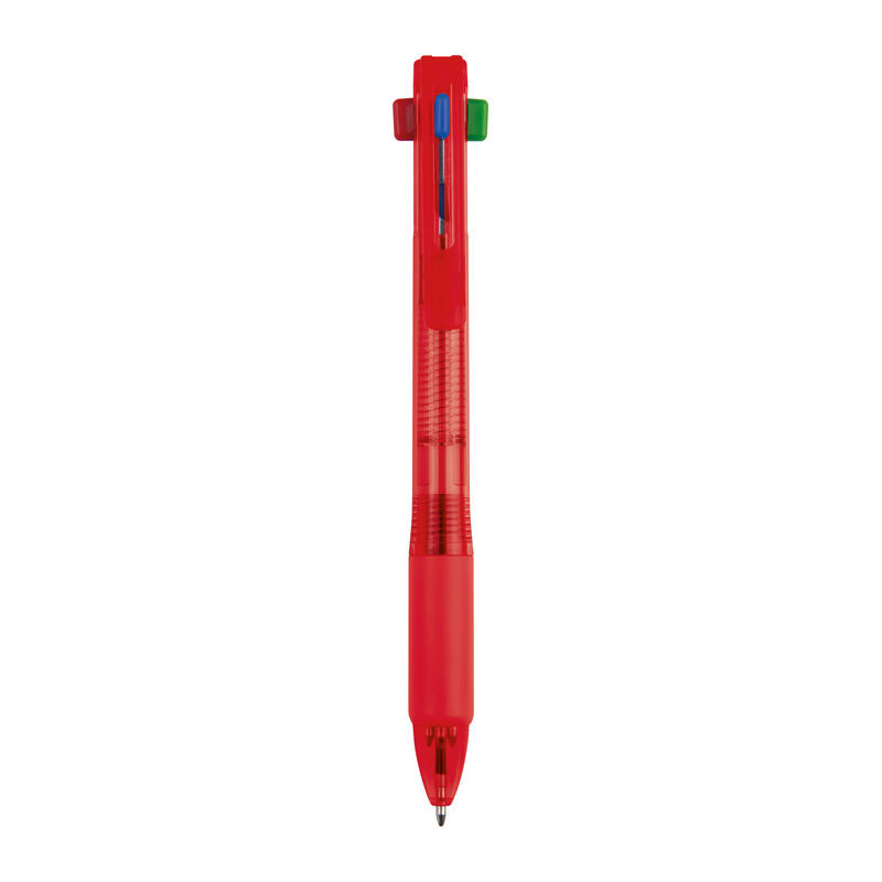 Kugelschreiber mit vier verschieden farbigen Schreibminen (blau, schwarz, rot und grün), welche nach Wunsch herausgeschoben werden können. Ihre Werbung drucken wir auf den Schaft.