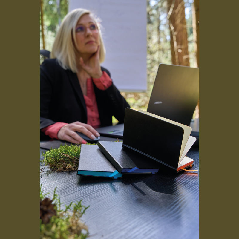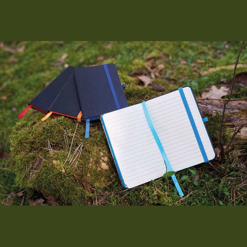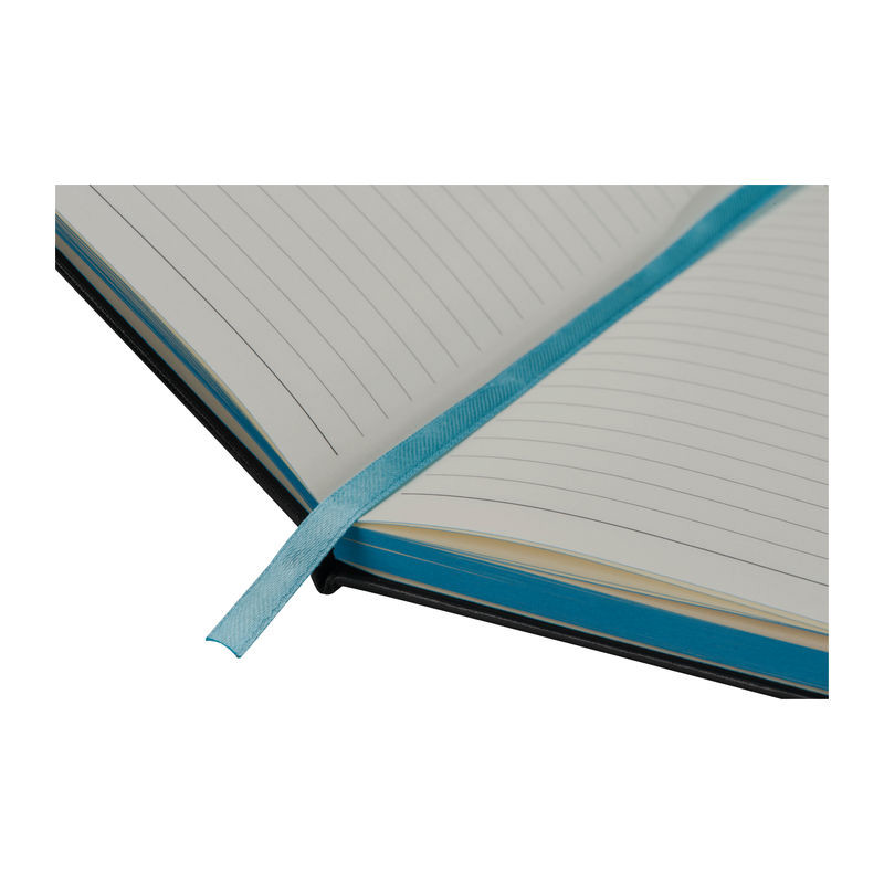 A5 Notizbuch im PU-Einband, Kugelschreiberschlaufe, Gummiverschlussband, Lesezeichen und 160 linierten Seiten. Der Werbeaufdruck erfolgt mittig auf der Vorderseite.