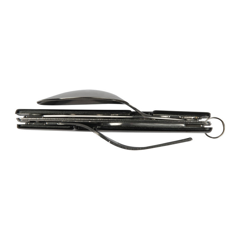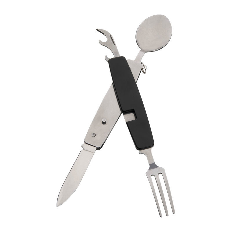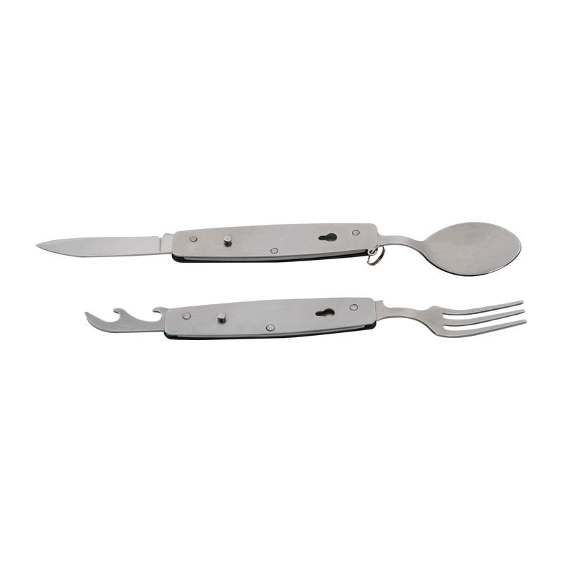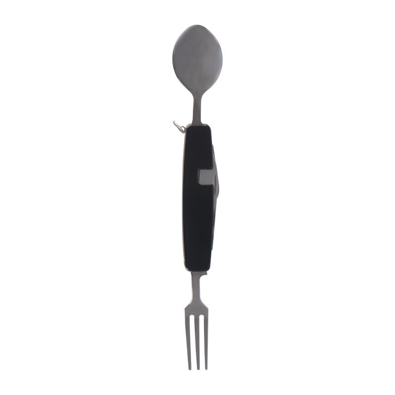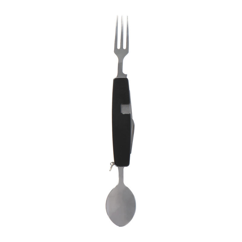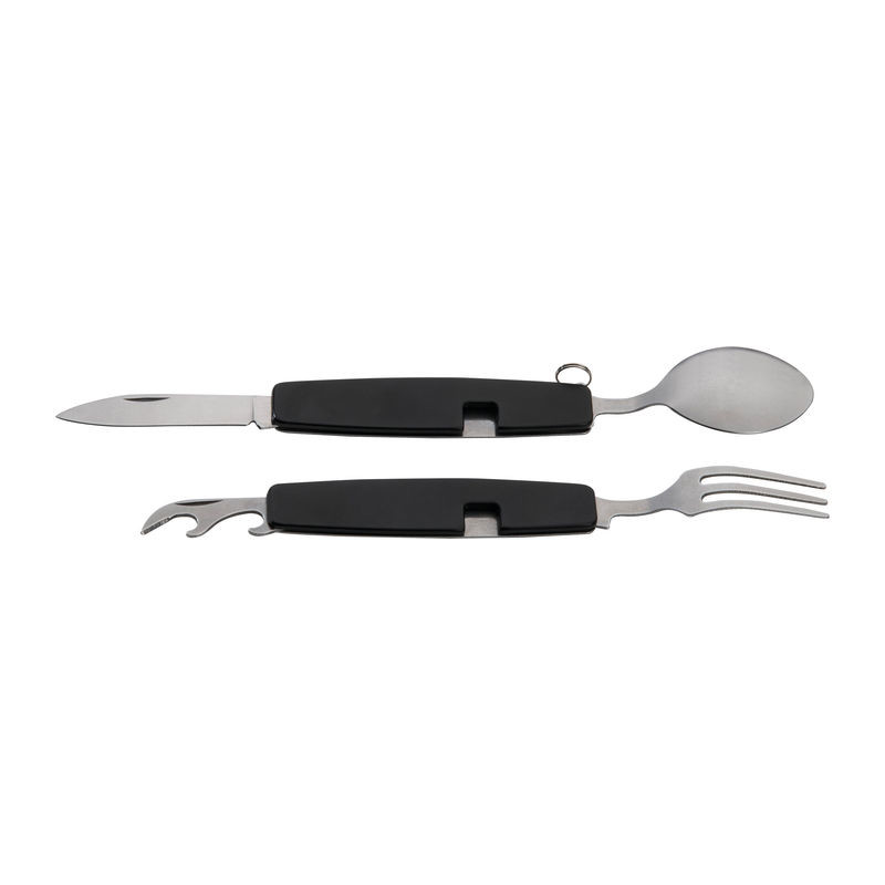 Zusammensteckbares Besteck, bestehend aus Löffel, Gabel, Messer, Flaschen- und Dosenöffner, ideal für Unterwegs. Ihre Werbung lasern wir auf das Mittelstück.