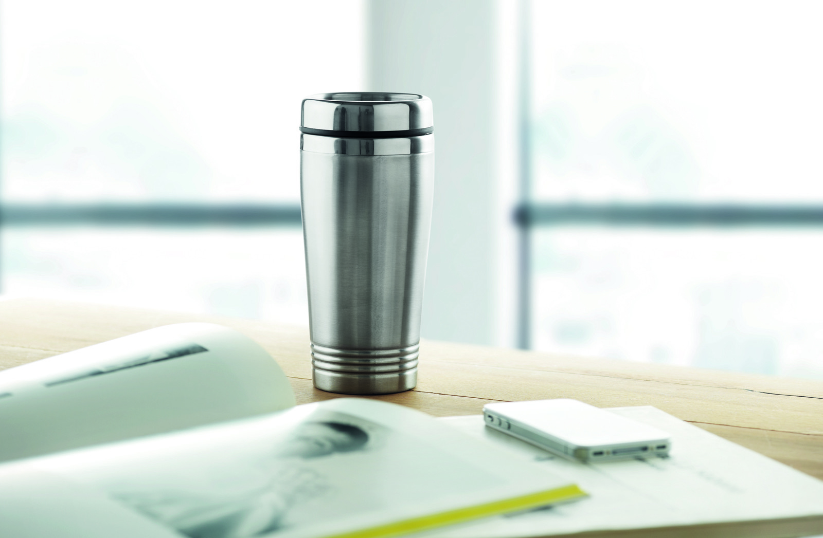 Doppelwandiger Trinkbecher aus Edelstahl mit schwarzen PP Deckel. Füllmenge: 400 ml.