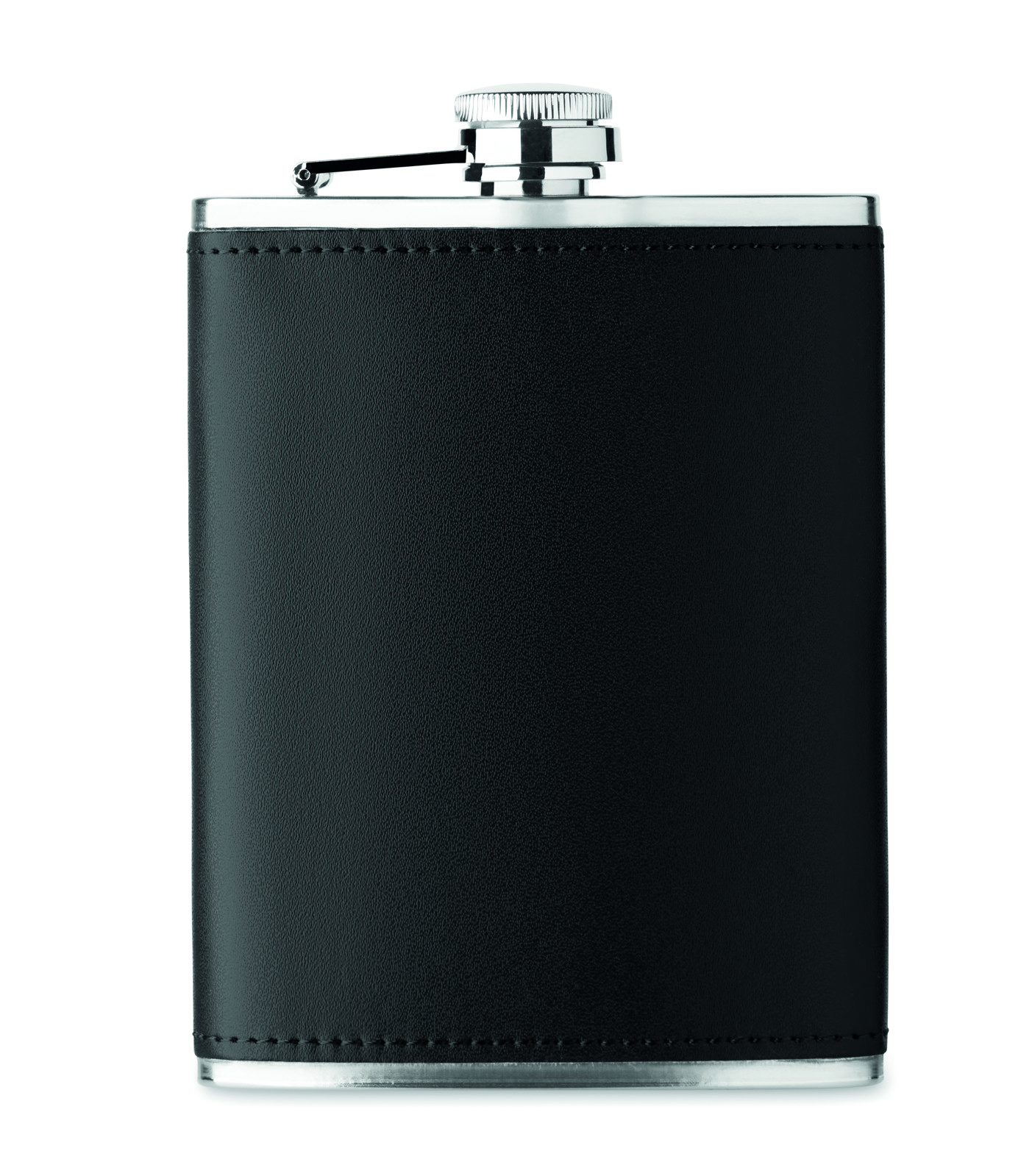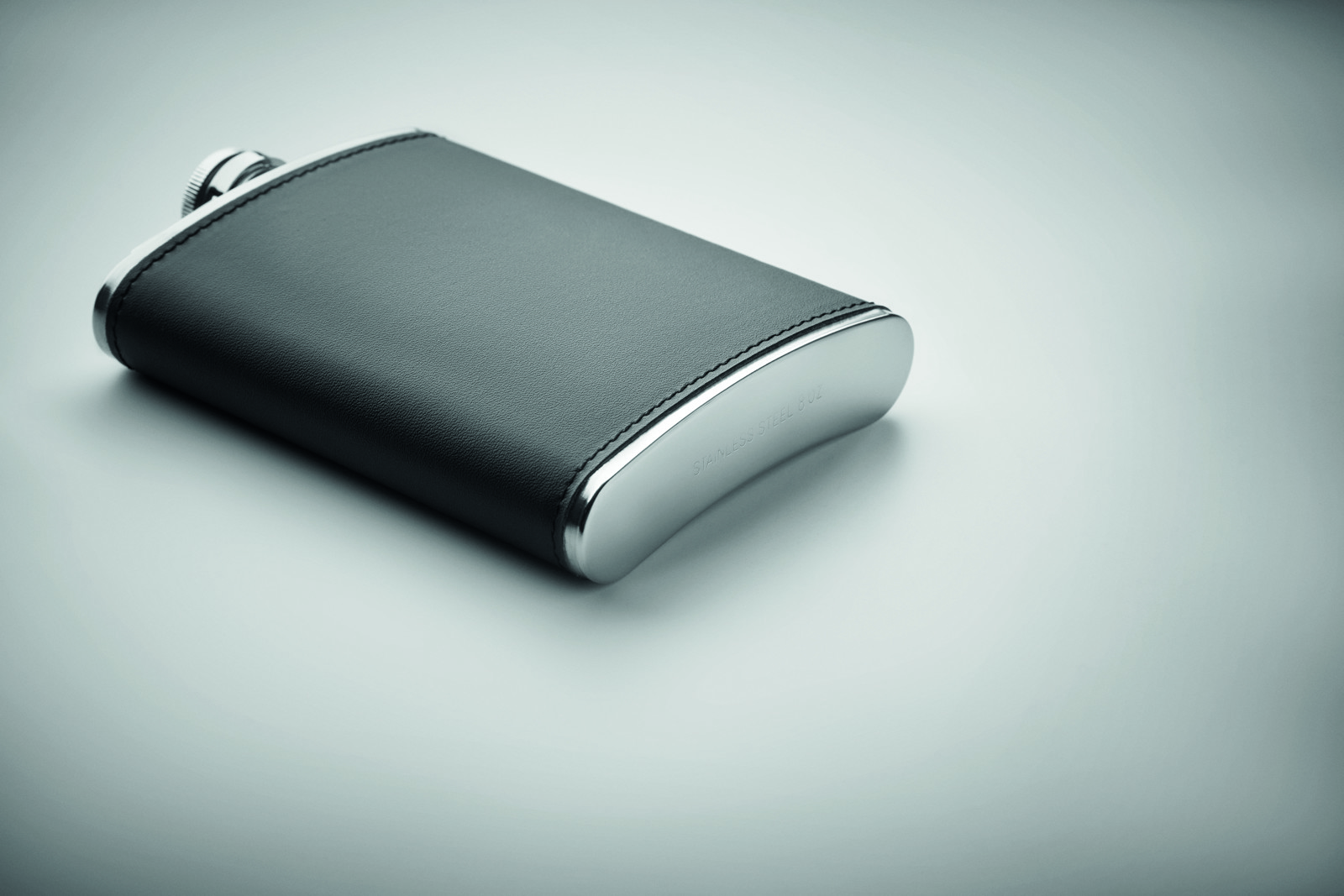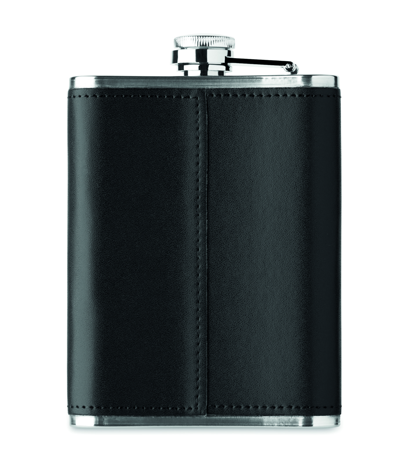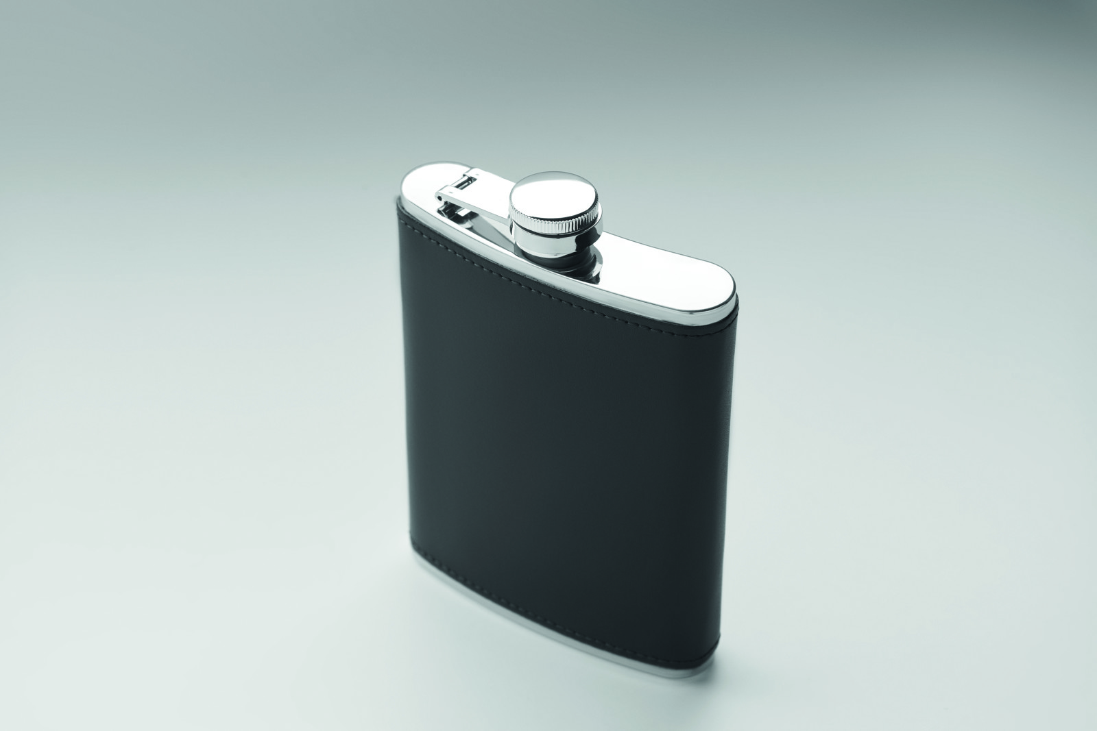 Flachmann aus Edelstahl mit PU-Hülle. Füllmenge: 200 ml.