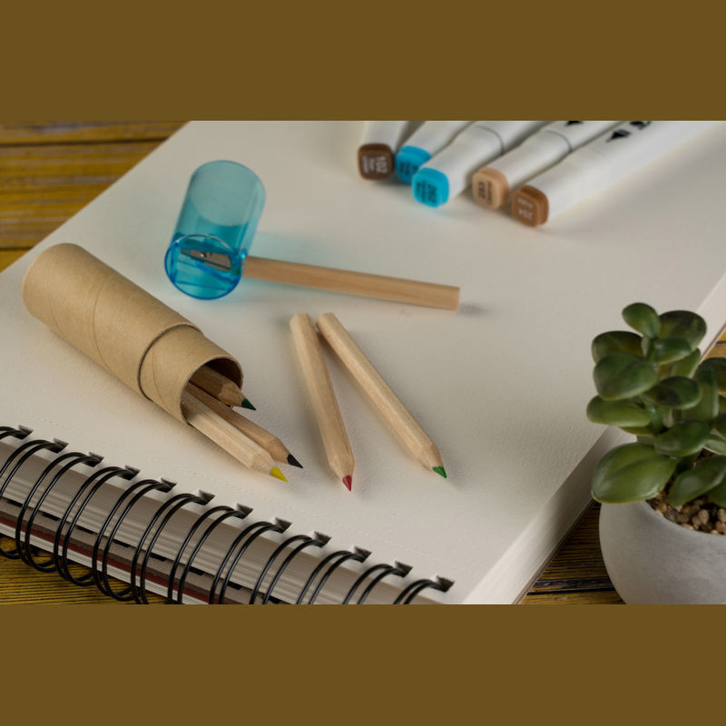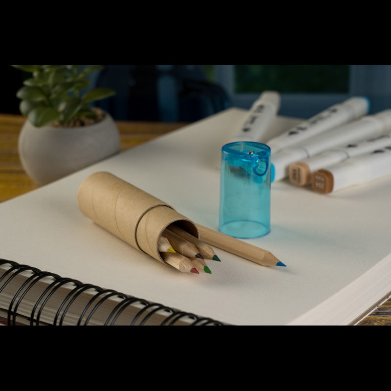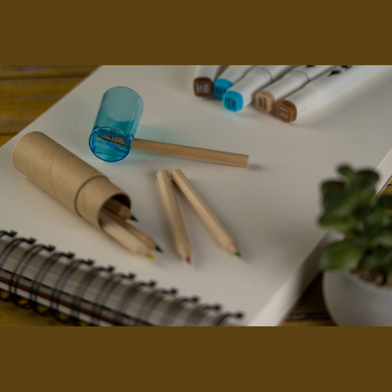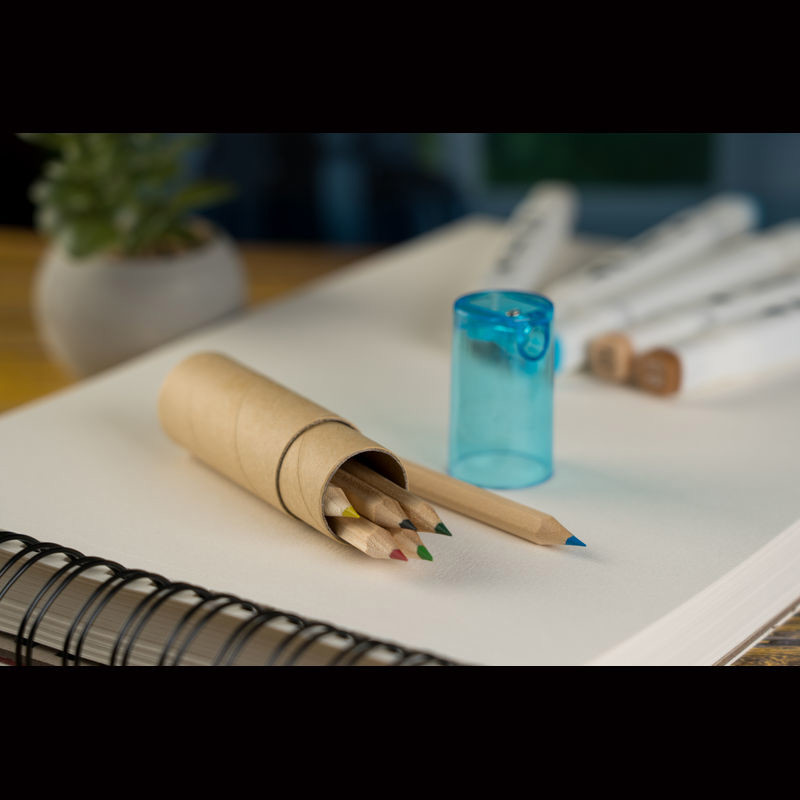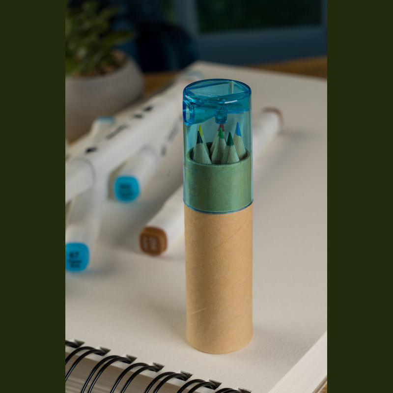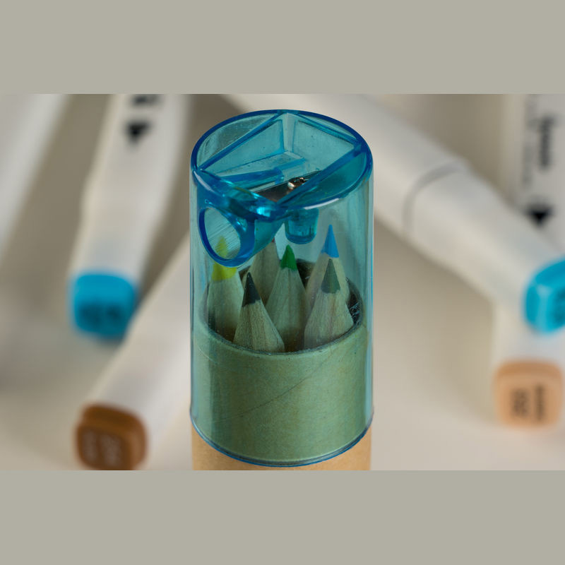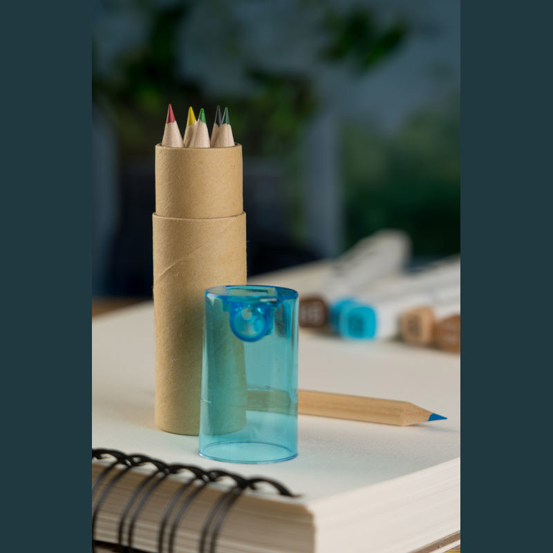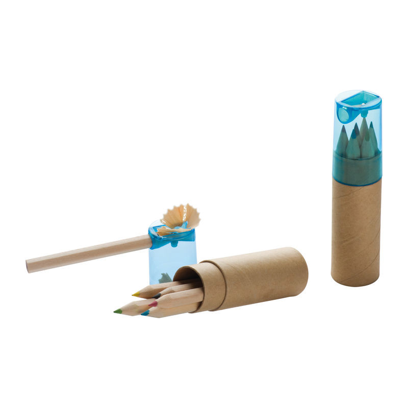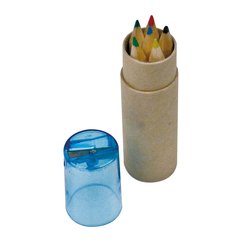 Pappbox mit sechs kurzen Buntstiften und integriertem Spitzer im blau-transparenten Deckel. Ihre Werbung drucken wir auf die Box.