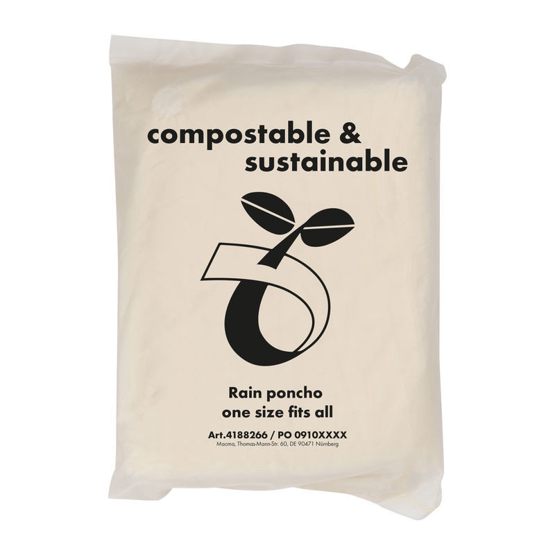 Gut für die Umwelt - Phthalatfreier, transparenter Regenponcho aus PLA mit Tragetasche zum Transportieren. Dieser Poncho ist kompostierbar und somit eine nachhaltige Alternative. Der Werbeaufdruck erfolgt auf der Tasche.