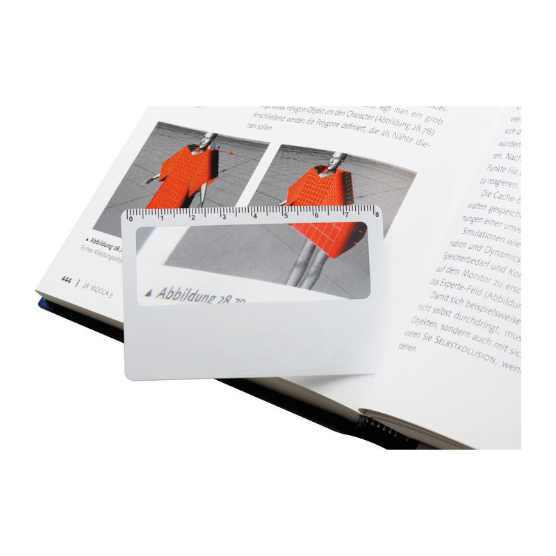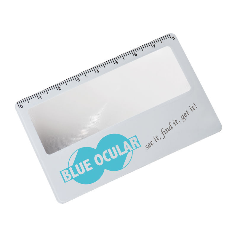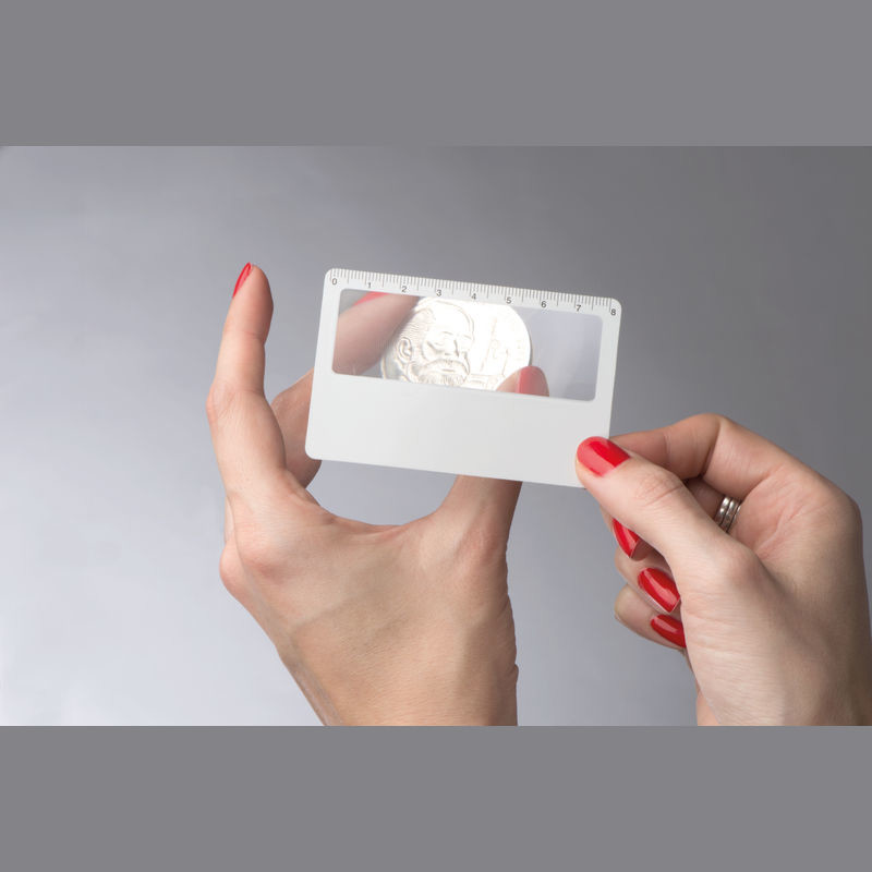 Leselupe im Scheckkartenformat mit Lineal an der Oberseite. Idealer Mailingverstärker oder Zugabeartikel (leicht+flach). Ihre Werbung drucken wir auf das weiße Feld.