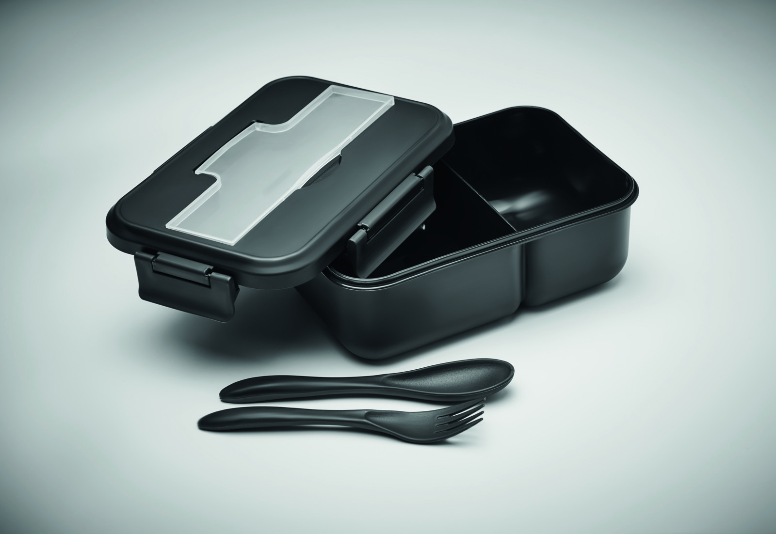 Lunchbox aus PP mit 2 Ebenen. Inkl. passendem Besteck und Henkel. Füllmenge gesamt: 1000 ml