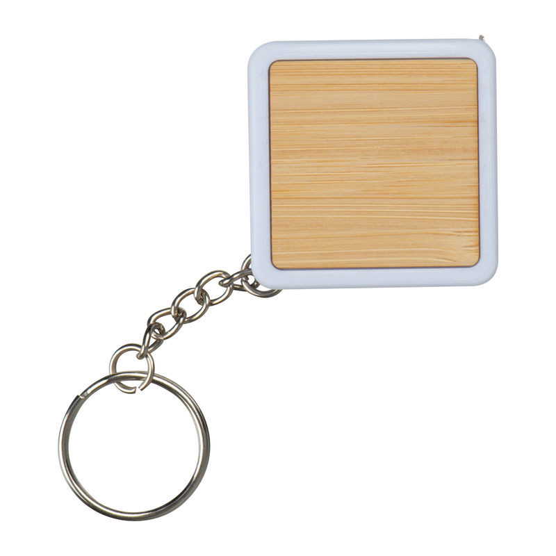 Maßband mit Schlüsselanhänger und dekorativen Bambusplättchen. Es verfügt über eine Messlänge von einem Meter. Ihre Werbung bringen wir mittels einer Lasergravur auf einer Seite des Maßbandes an.