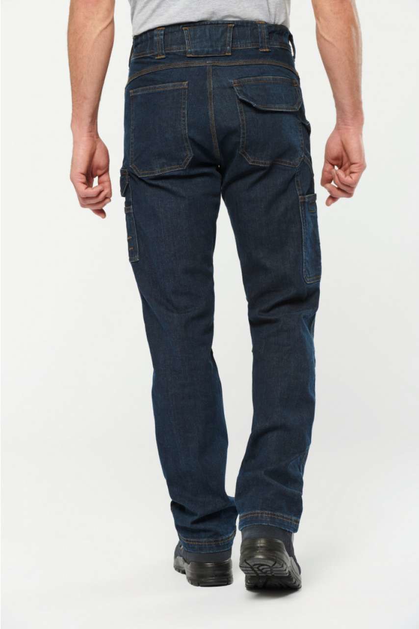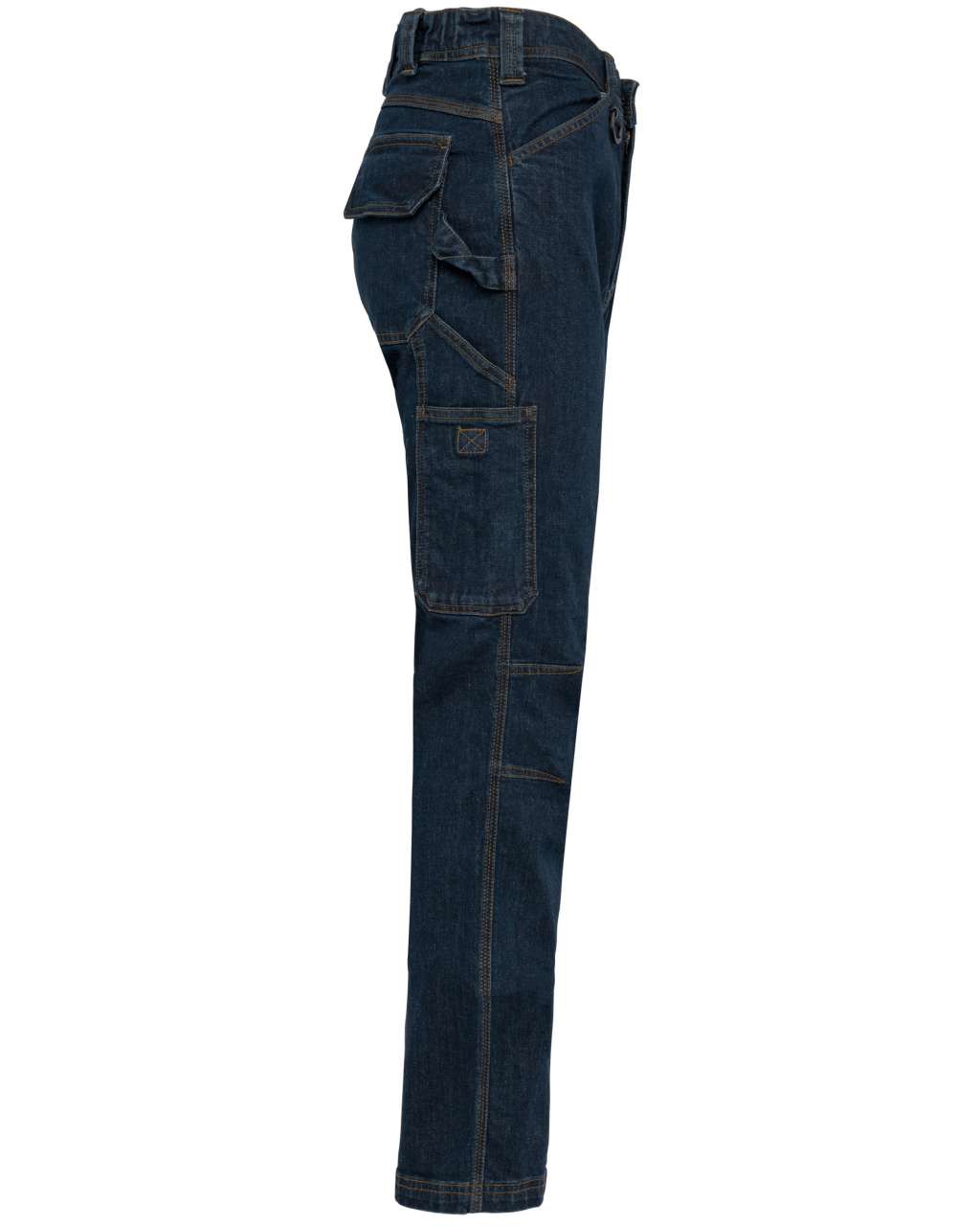 99% cotton/1% elastane Denim canvas Washable at 60°C Slim fit Button fastening with button cover and metal zip Front: 2 slanted opening pockets Left: reinforced seam pocket with flap and tear release fastening + 3-compartment over-pocket, 1 of which has pen compartment Right: hammer pocket, tape pocket and over-pocket with tear release fastening Back: 2 patch pockets with reinforced seams, 1 with a tear release fastening flap Rounded belt at back with wide inner non-slip elasticated band for optimal support Orange inner buckle at middle of back Loops with reinforced seams including one large one in the middle of the back and 1 plastic ring at the front Darts at the knee for added comfort Reinforced crotch gusset for increased resistance and perfect freedom of movement Triple overstitching on side seams, inside leg and rear split Twin needle finish at hem Tear-away brand label