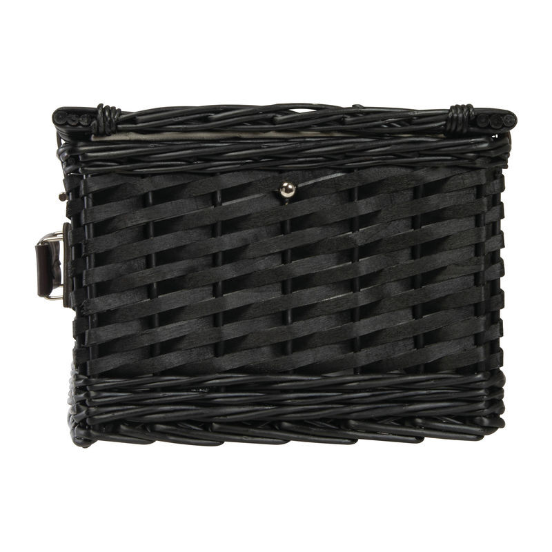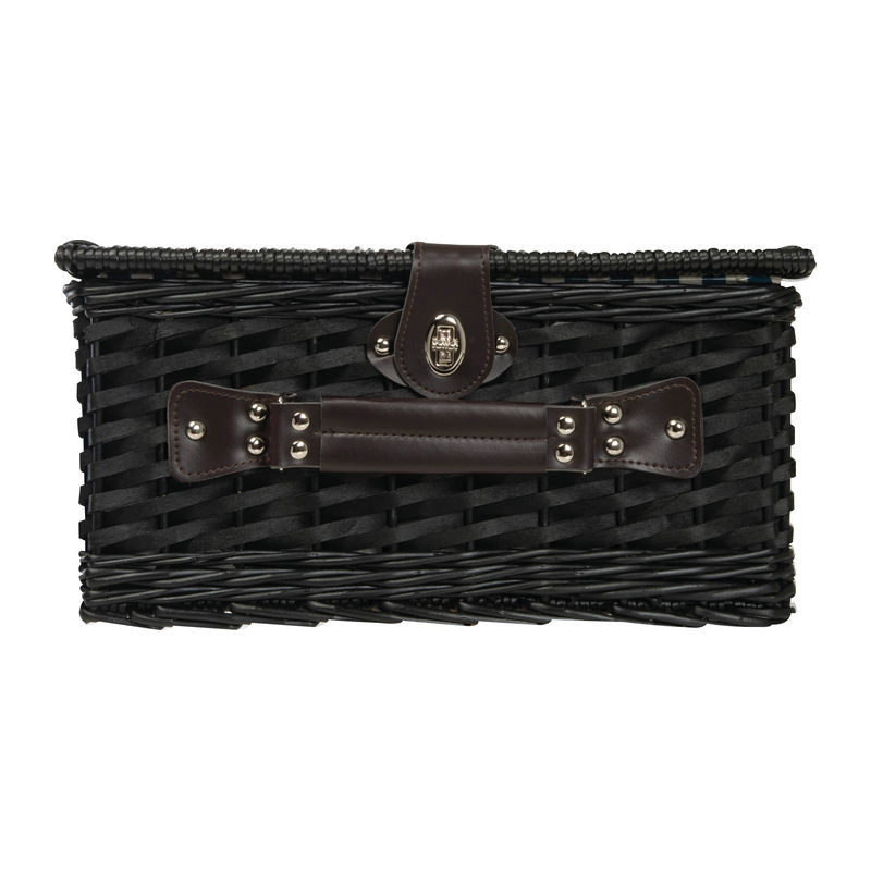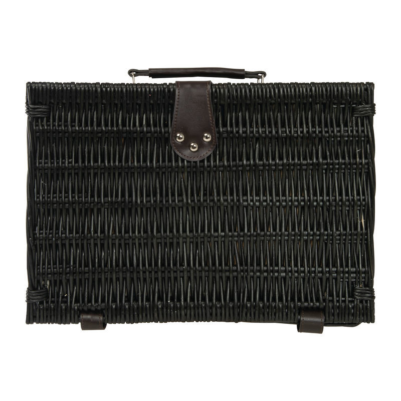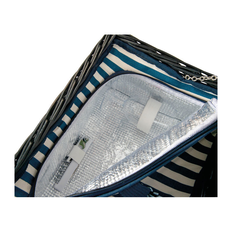 Mini-Picknick-Kühlkorb aus Weidengeflecht für zwei Personen mit Keramiktellern und -tassen, Edelstahlbesteck und Salz- und Pfefferstreuer. Ihre Werbung lasern wir auf ein Metallemblem, dass dann am Korb befestigt wird.