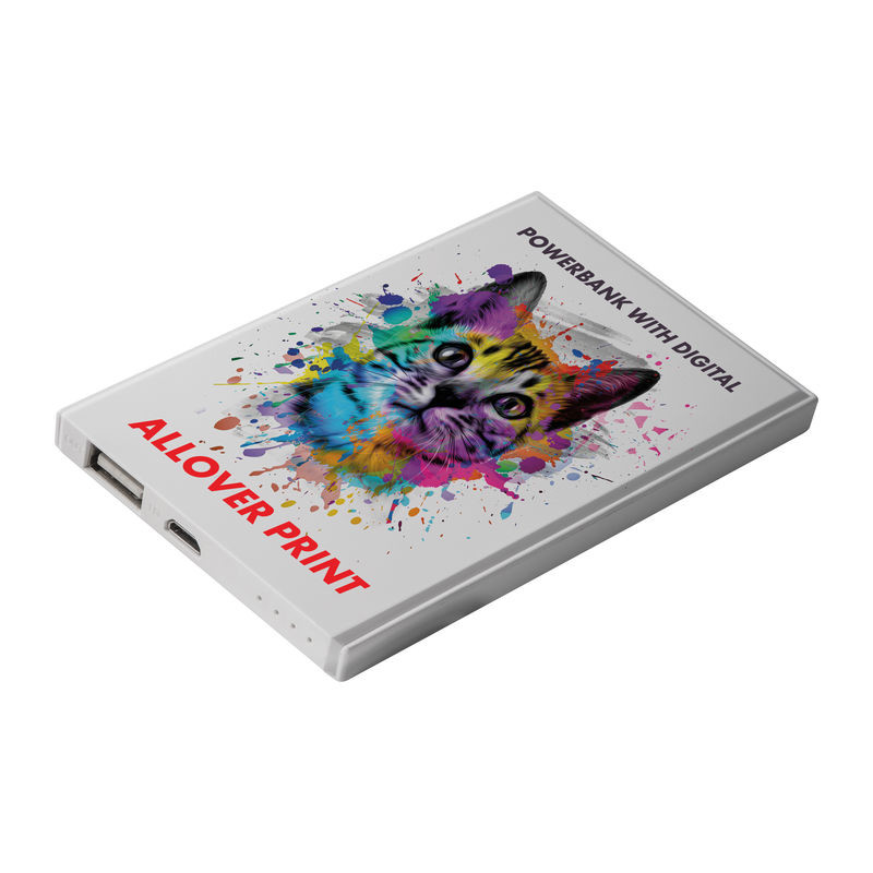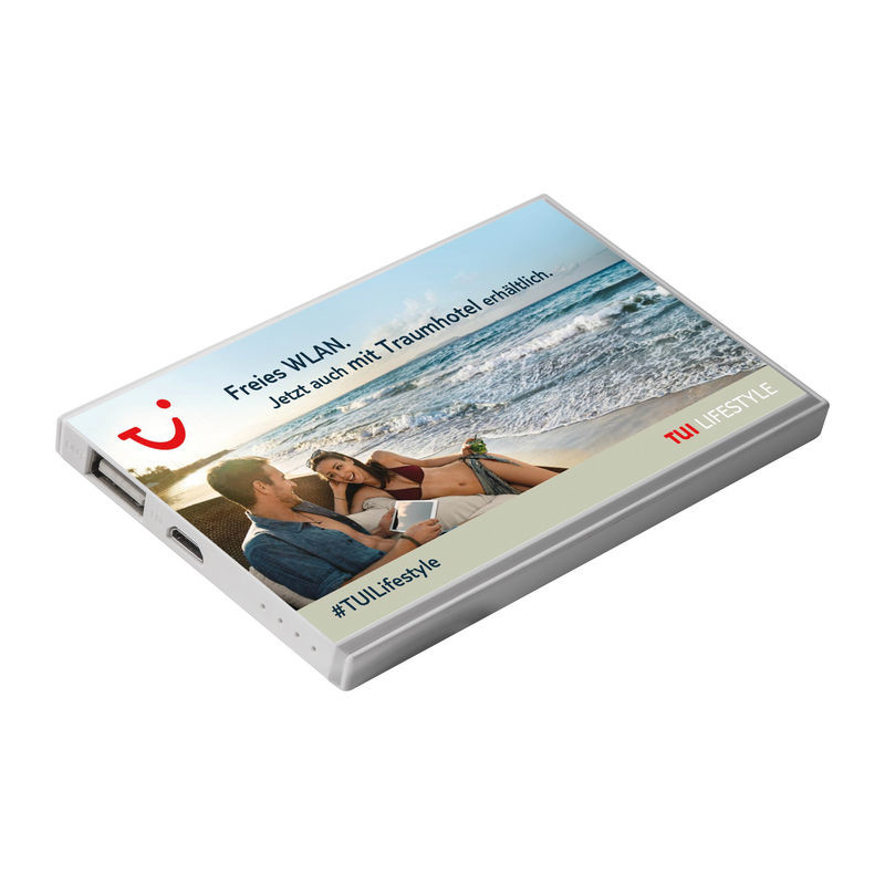 Powerbank mit einer Kapazität von 2.200 mAH und Ladestandanzeige, inkl. USB-Ladekabel. So kann Ihr Smartphone auch unterwegs aufgeladen werden. Ihre Werbung drucken wir im UV-Druck (CMYK) direkt auf die Powerbank.