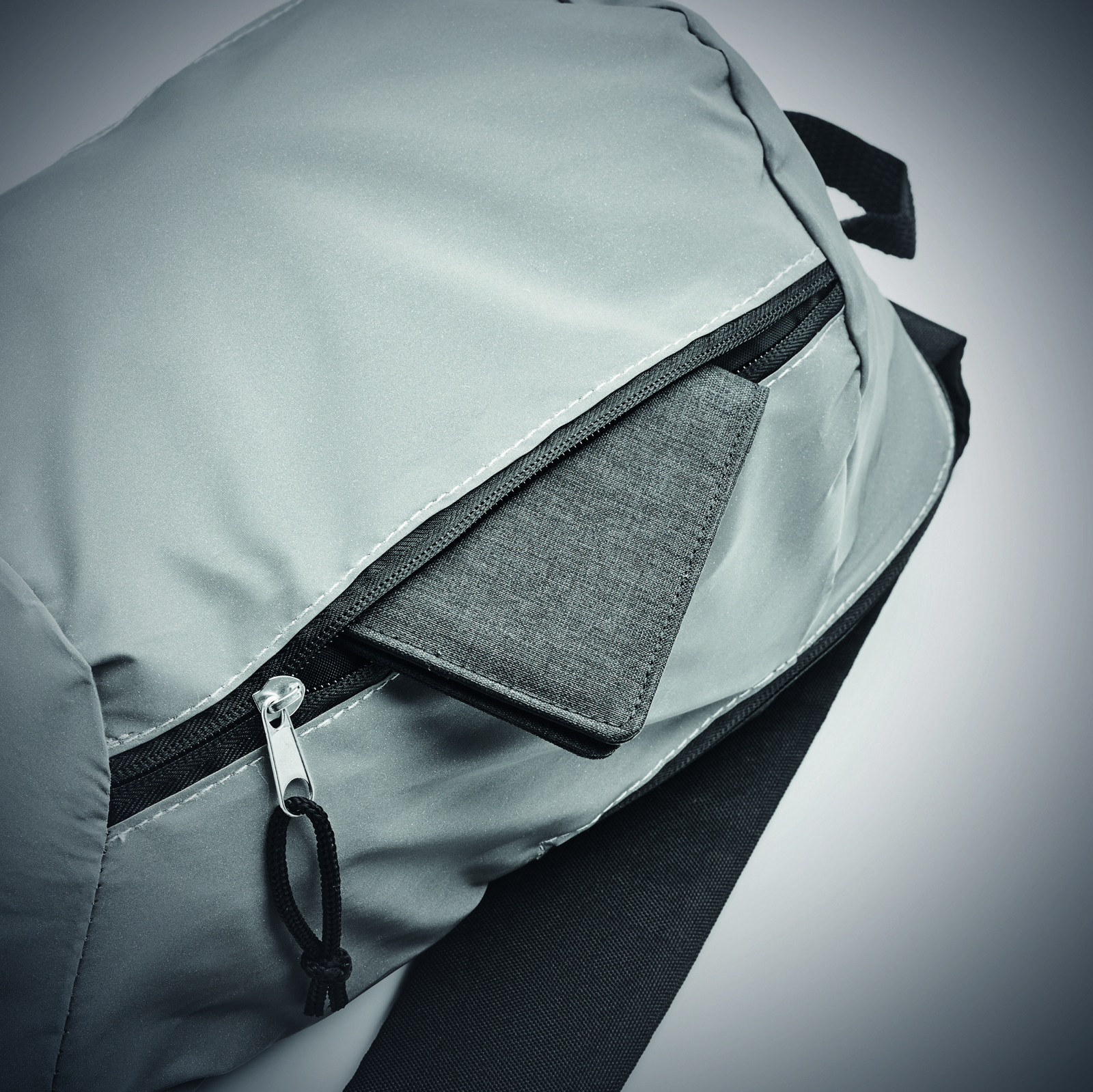 Rucksack mit Front aus hoch reflektierendem Polyester. Fronttasche mit Reißverschluss. Gepolsterte Rückseite. 600D Polyester.