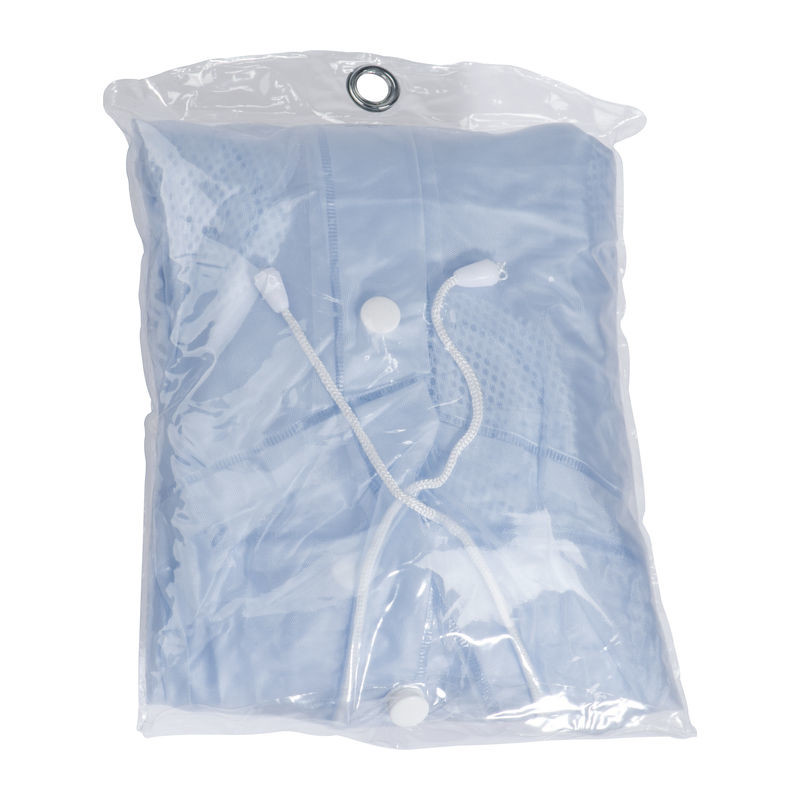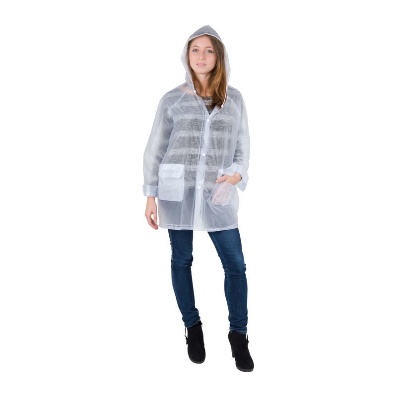 PVC-Regenjacke (Einheitsgröße XL) transparent gefrostet mit Kapuze, zwei Fronttaschen und Druckknöpfen. Ihren Werbeaufdruck bringen wir auf der Brust (Herzseite) an.