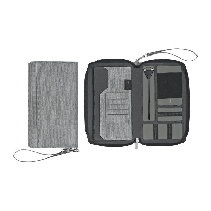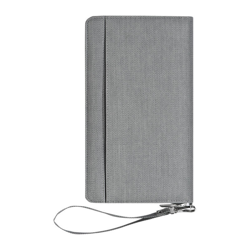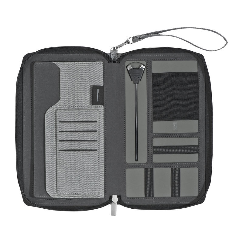 Reisemappe aus Alpha-PU inklusive Powerbank (Kapazität 4.000mAh), inkl. USB-Ladekabel, diversen Einsteckfächern, Kugelschreiberschlaufe und abnehmbarer Handschlaufe. Ihre Werbung drucken wir außen auf die Mappe.