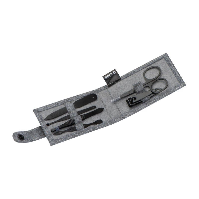 Ansprechendes Manikürset aus recyceltem RPET Filz . Es verfügt über eine Nagelschere, Nagelfeile, Nagelknipser, Pinzette sowie zwei Nagelhautschieber. Ihre Werbung bringen wir vorne auf dem Etui an.