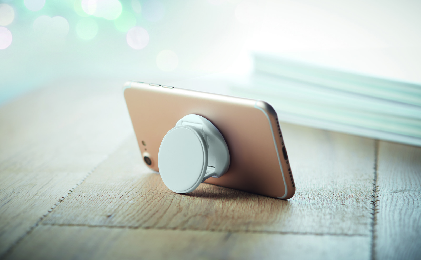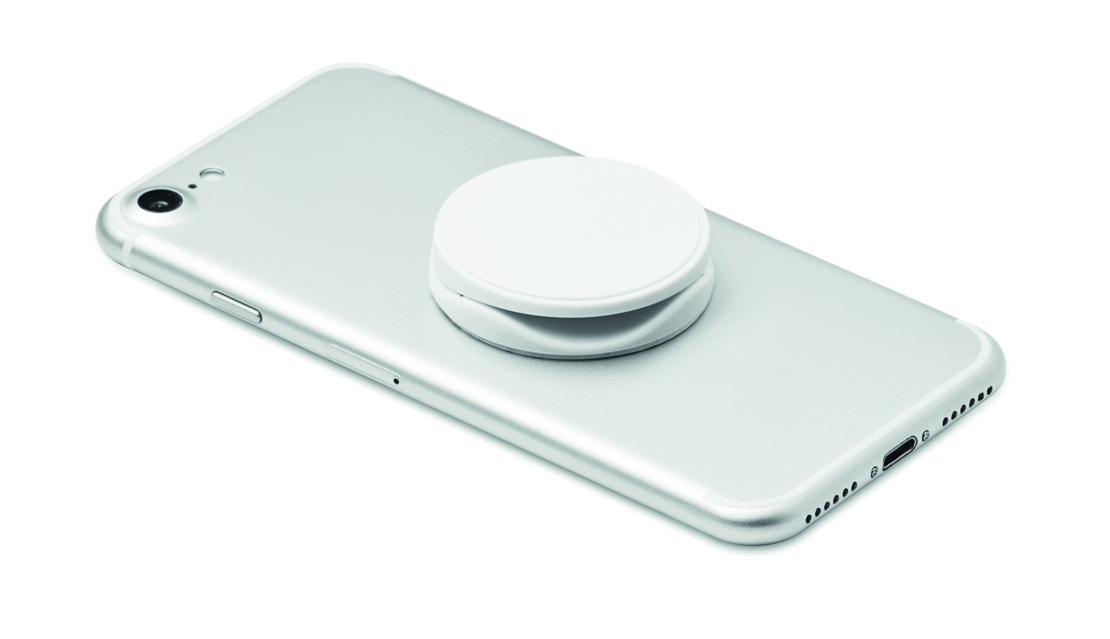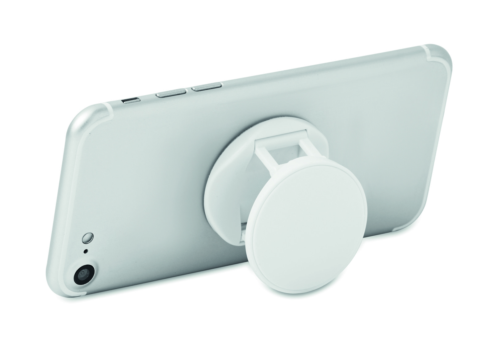 Rundes, faltbares Telefonzubehör aus ABS mit zwei Funktionen: Telefonständer und Halterung. Auf der Rückseite befindet sich ein 3M- Aufkleber.