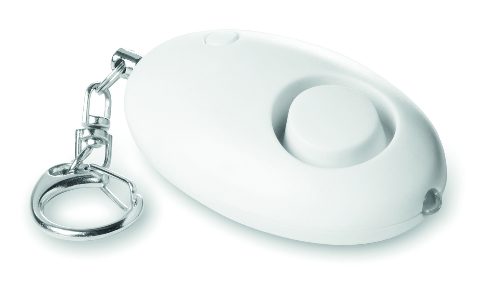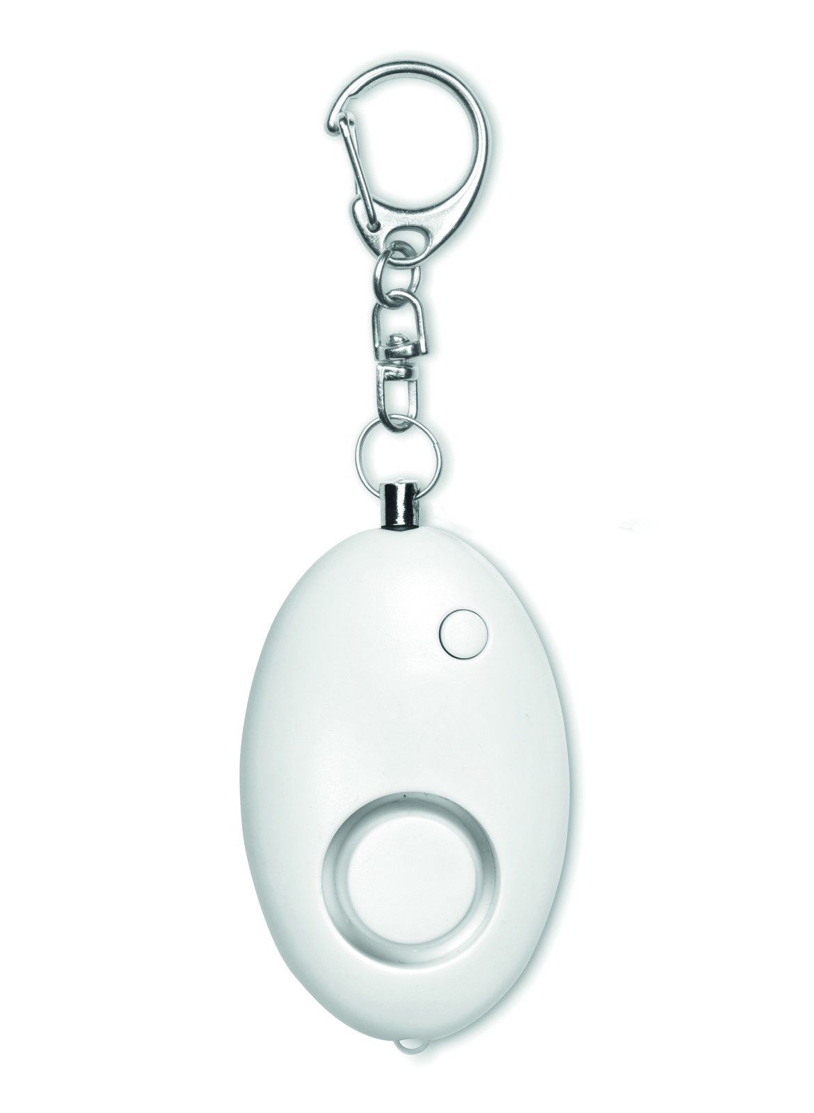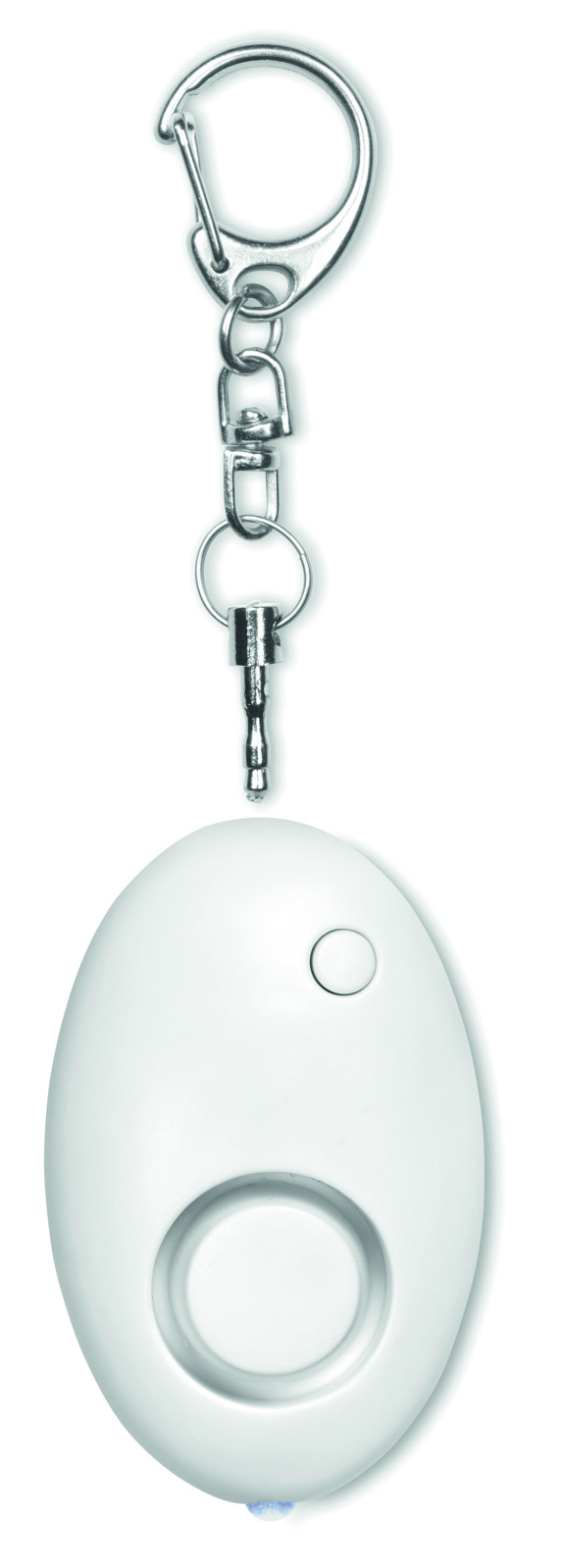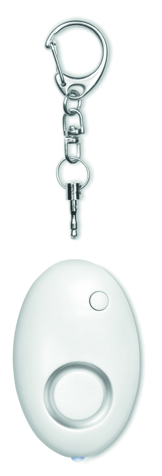 Schlüsselring mit Mini Panik-Alarm. Dieser wird durch das Herausziehen des Stiftes aus dem Kunststoffanhänger aktiviert. ABS Gehäuse. Mit 1 LED Licht. Inklusive 3 AG13 Batterien.