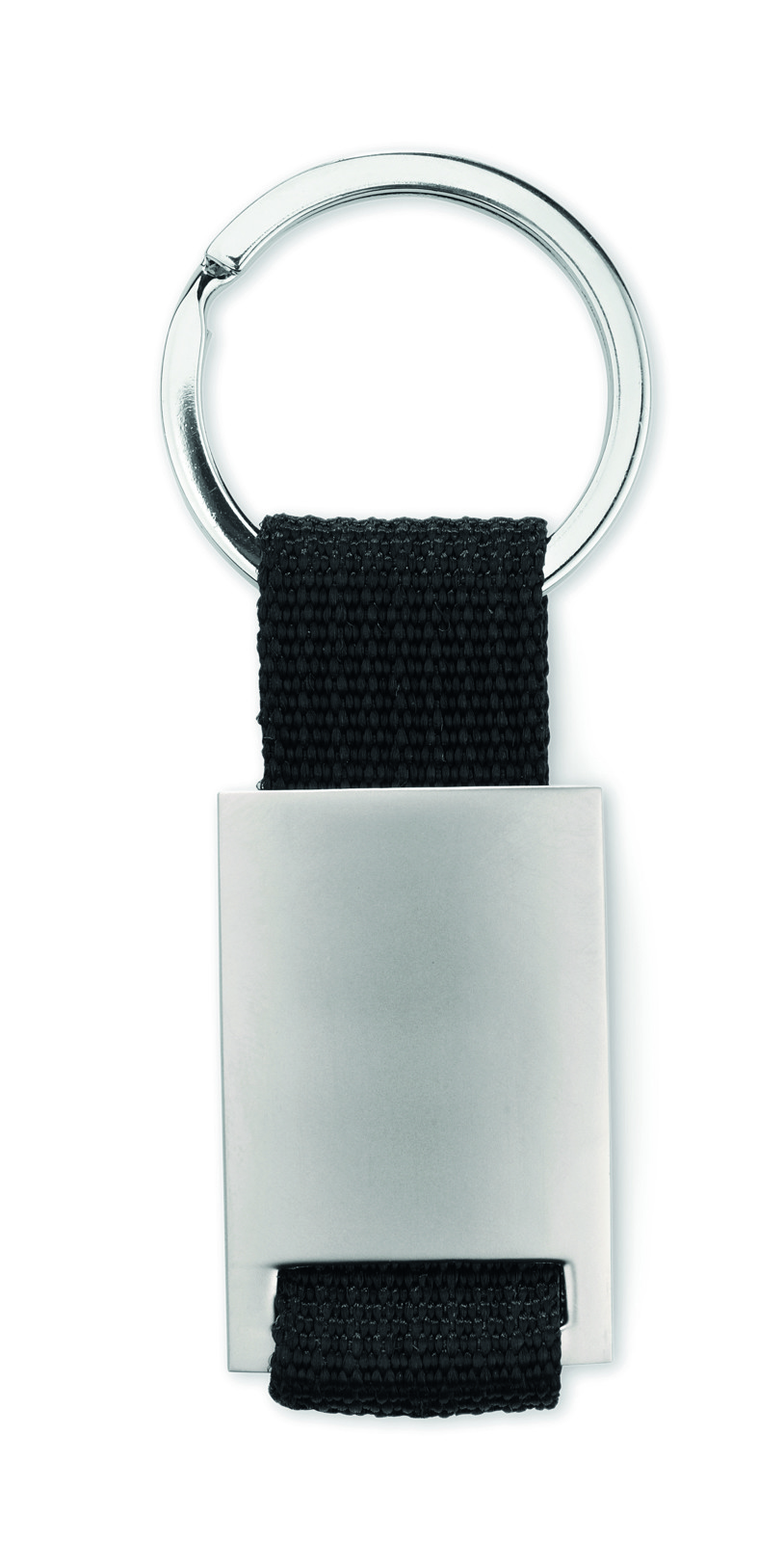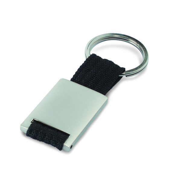 Schlüsselring aus Metall mit Zinklegierung und Textil-Anhänger.
