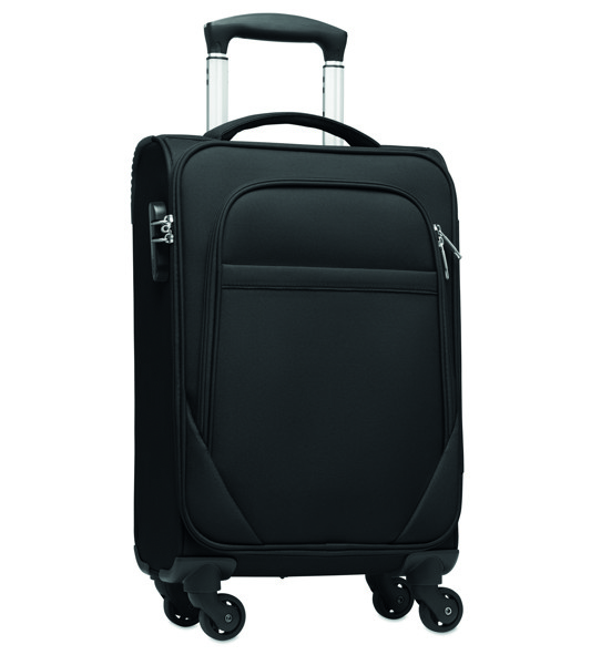 Kabinen Trolley aus 600D RPET Polyester. Außenfach mit Reißverschluss sowie Fronttasche mit Reißverschluss. Mit integriertem Zahlenschloss.