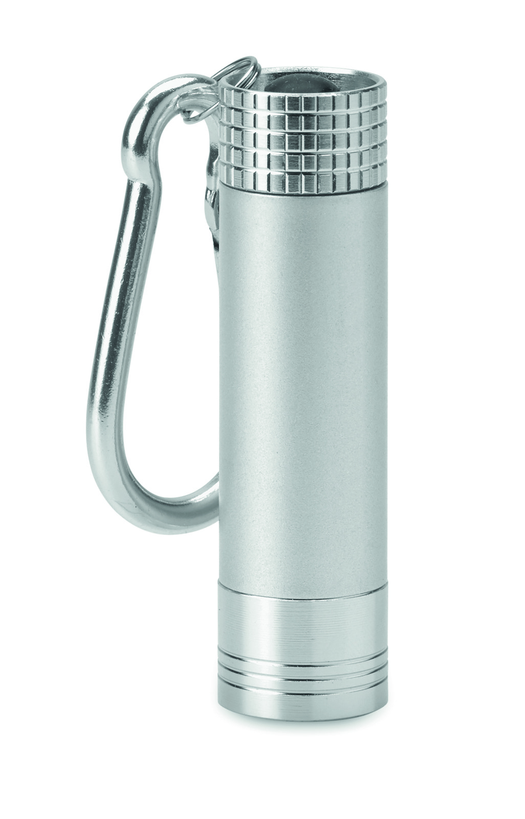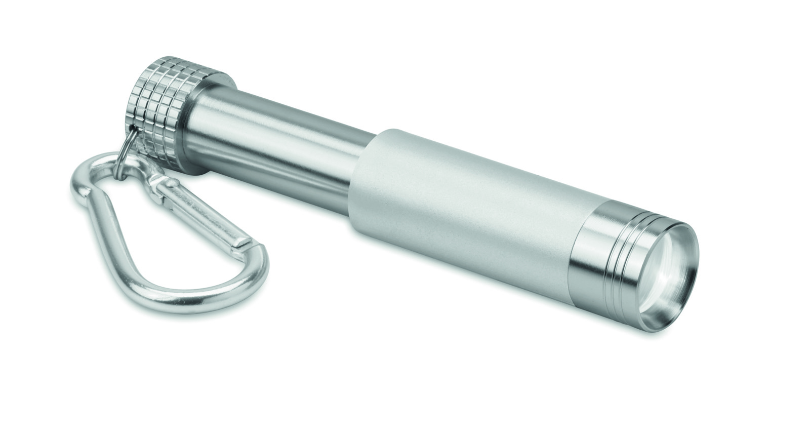 Kleine LED-Taschenlampe. Aluminium und ABS. Mit Karabiner. Wählen Sie eine Lasergravur, um Ihre Werbeanbringung zu beleuchten. Inkl. 4 LR44 Batterien.