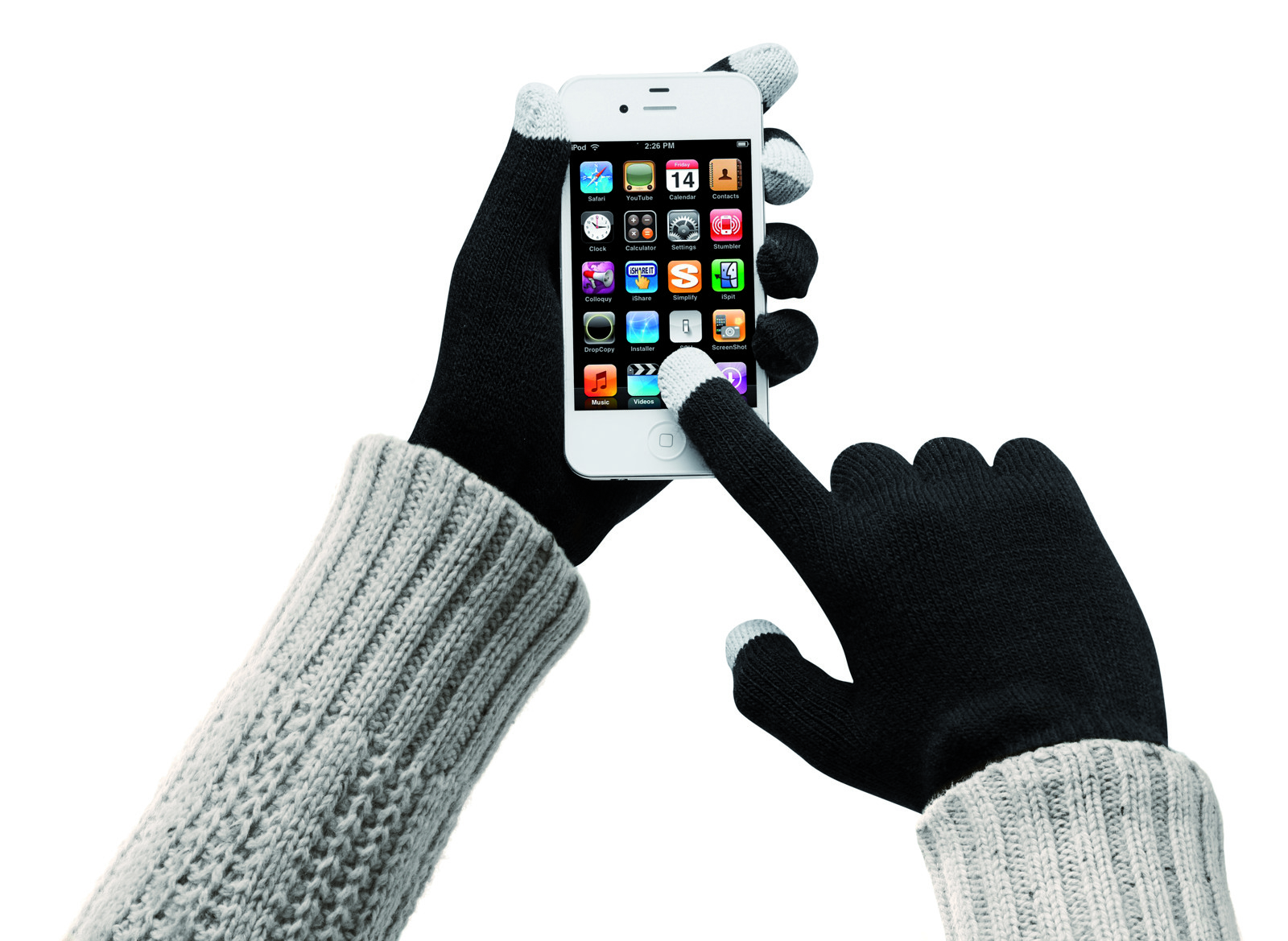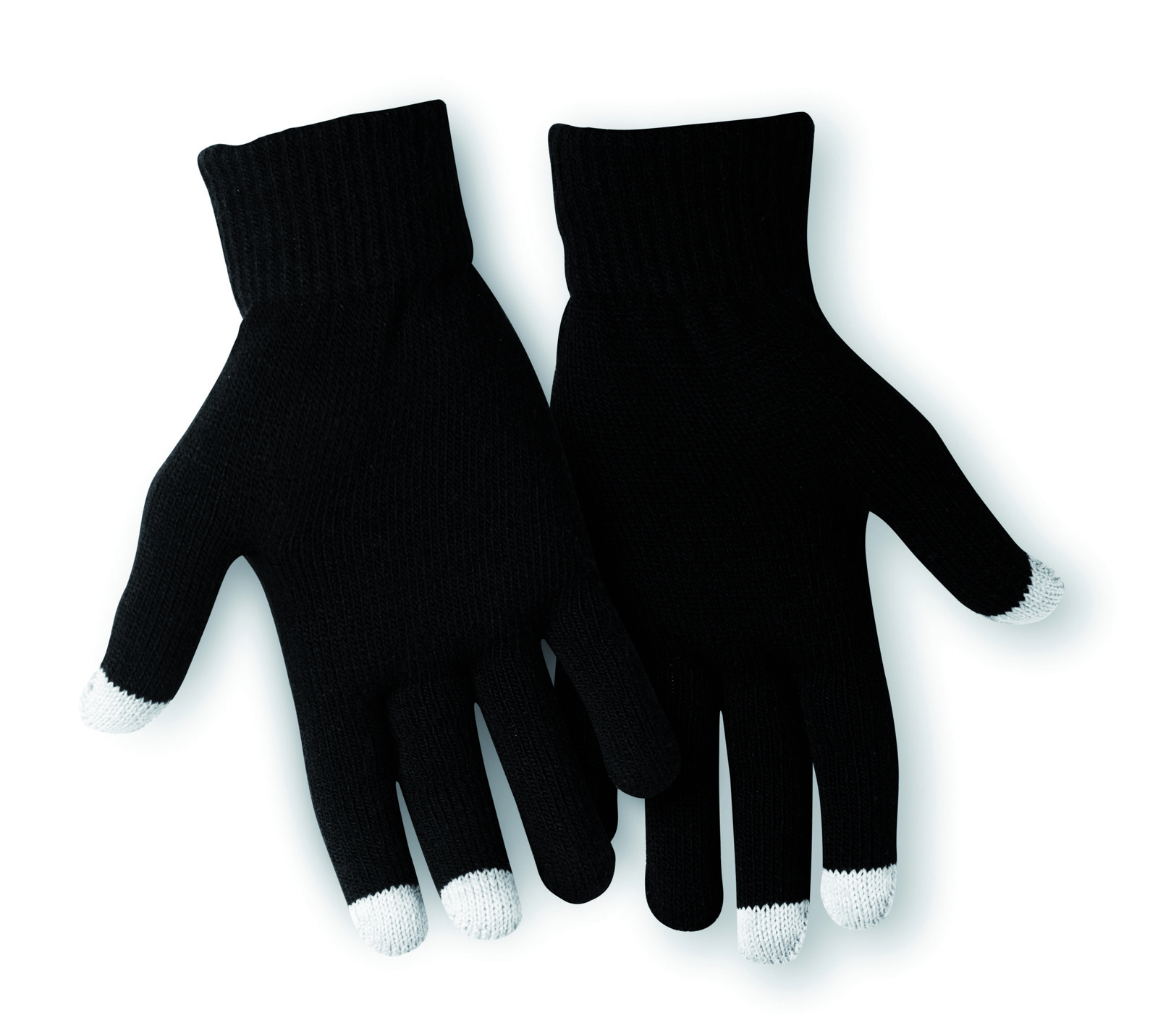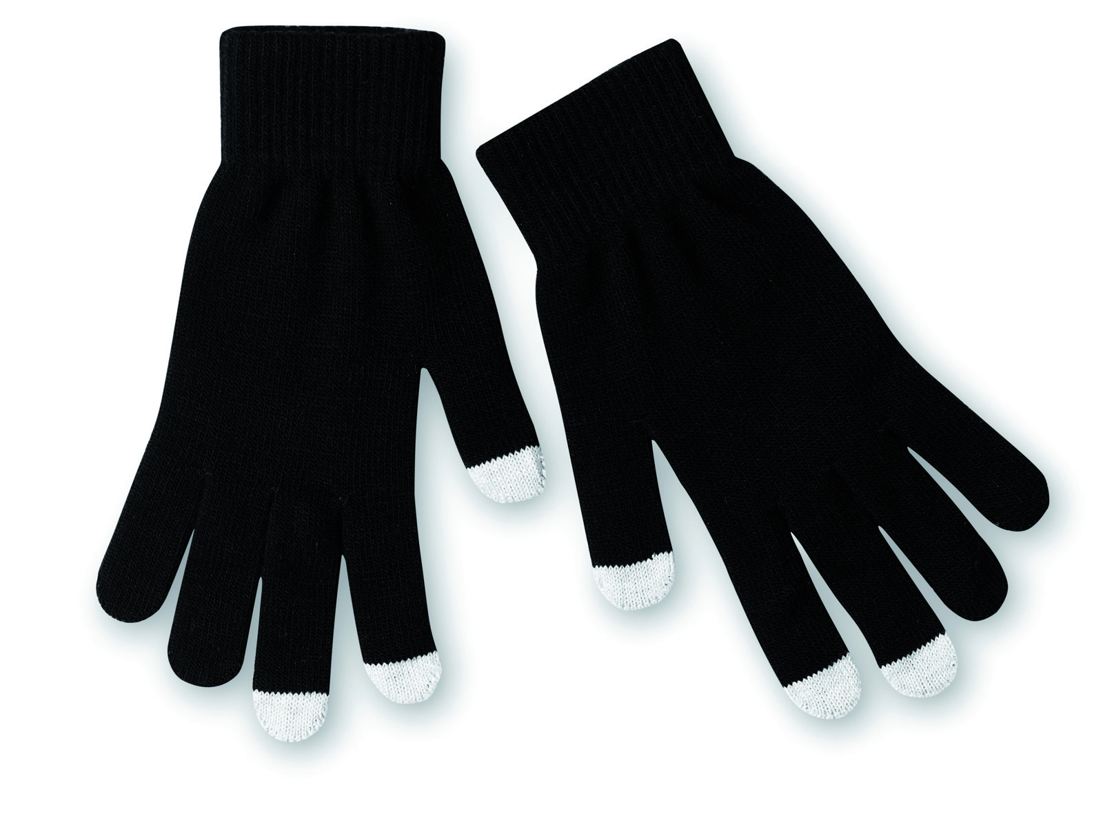 Touchscreenfähige Handschuhe aus Acryl. 3 Fingerspitzen bestehen aus 0,5% Edelstahlfaser, 89,5% Acryl und 10% Elasthan. Die Größe der Handschuhe kann aufgrund des Elasthan Anteils variieren.