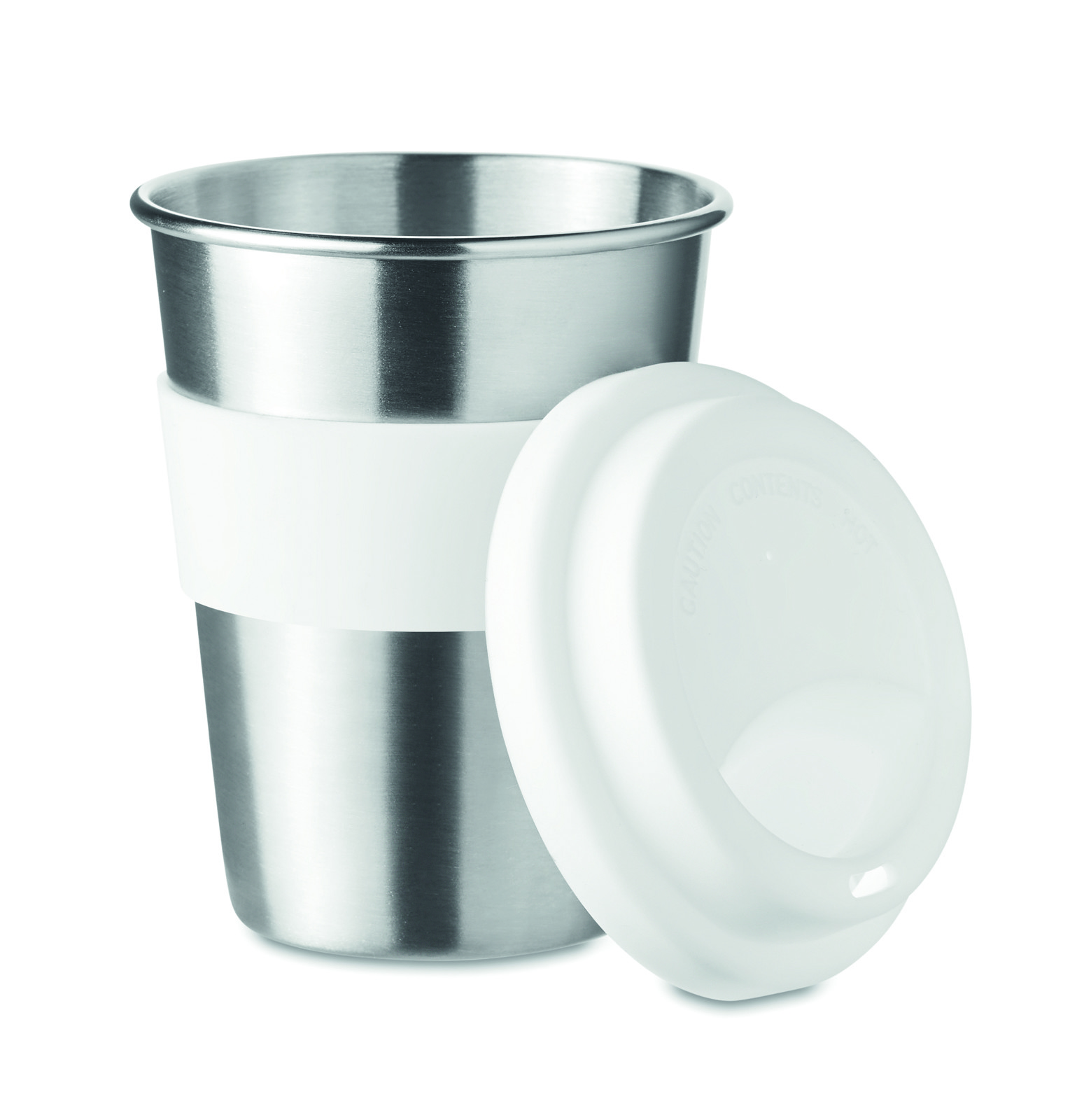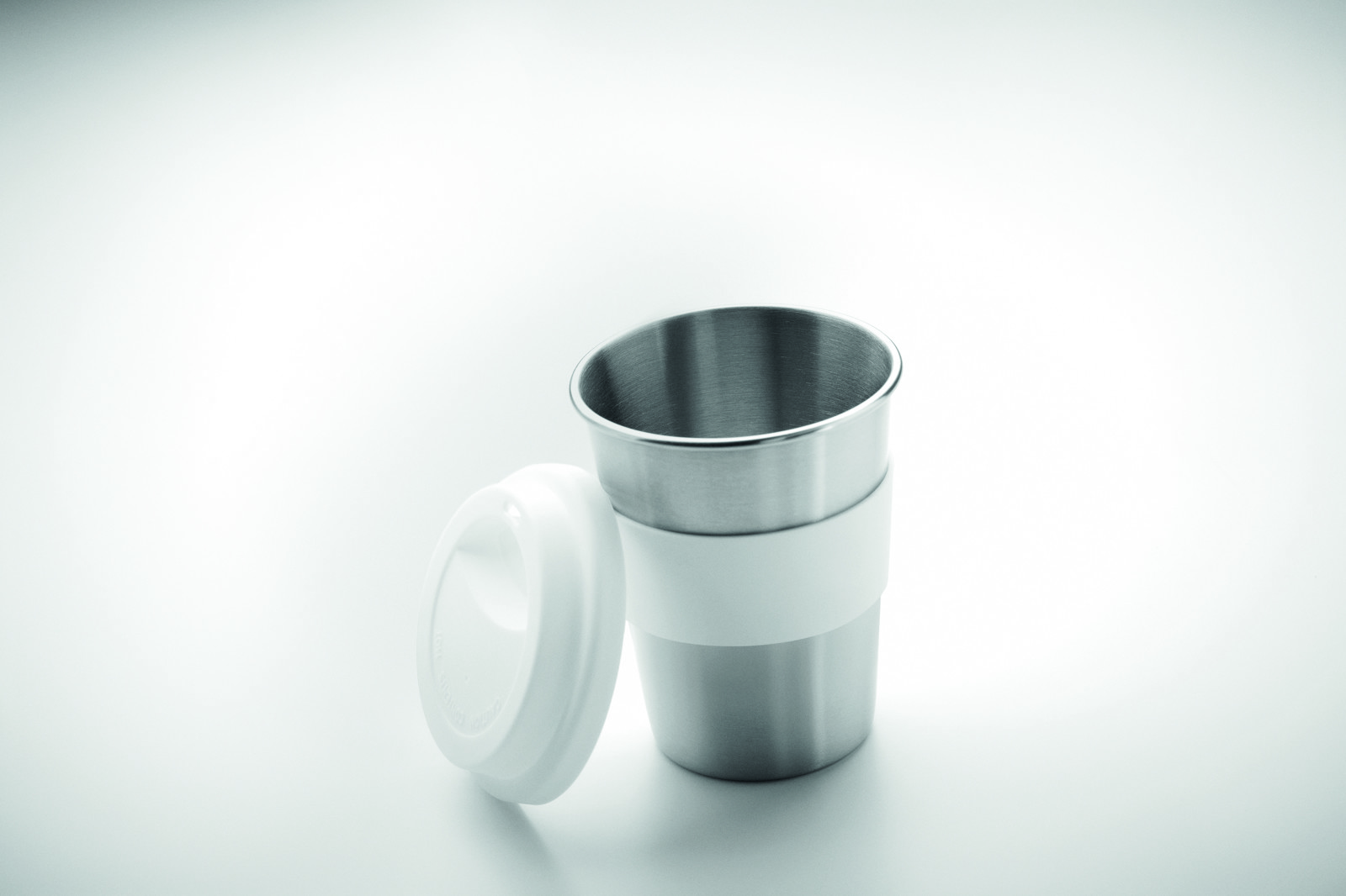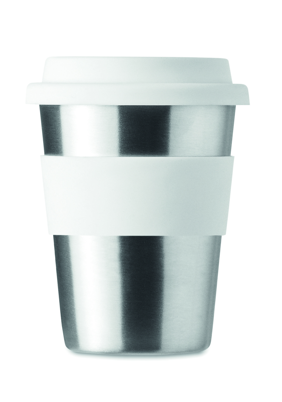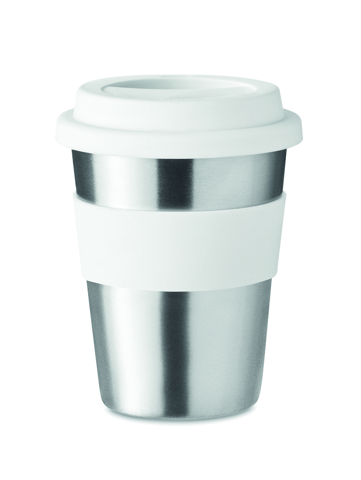 Einwandiger Trinkbecher aus Edelstahl mit Griffteil und Deckel aus Silikon. Füllmenge: 350 ml. Da der einwandige Becher die Hitze nach Außen leiten kann, kann der Artikel heiß werden.