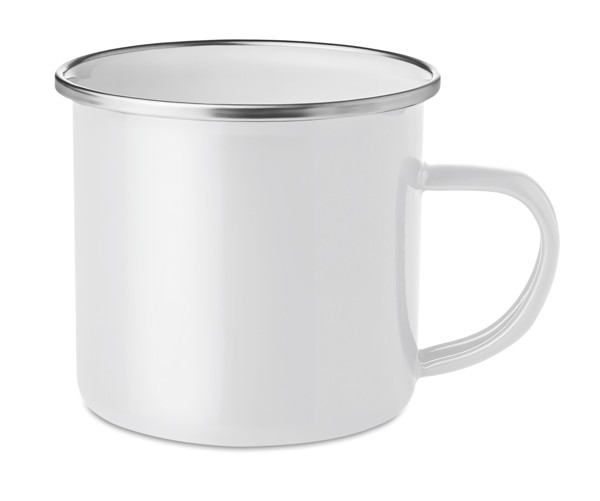 Emaillierter Metall-Becher im Vintage-Look. Füllmenge: 350 ml. Bitte beachten: Keine Drucktechnik ist spülmaschinengeeignet, auch Keramik-Transferdruck nicht.