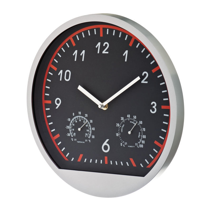 Wanduhr im coolen Sportdesign. Die Uhr verfügt über ein Thermo- und ein Hygrometer. Ihre Werbung drucken wir auf den Rahmen unterhalb der sechs. Exklusive einer AA Batterie (Bestellen Sie diese gleich mit, siehe letzte Seite oder Artikel 999300).