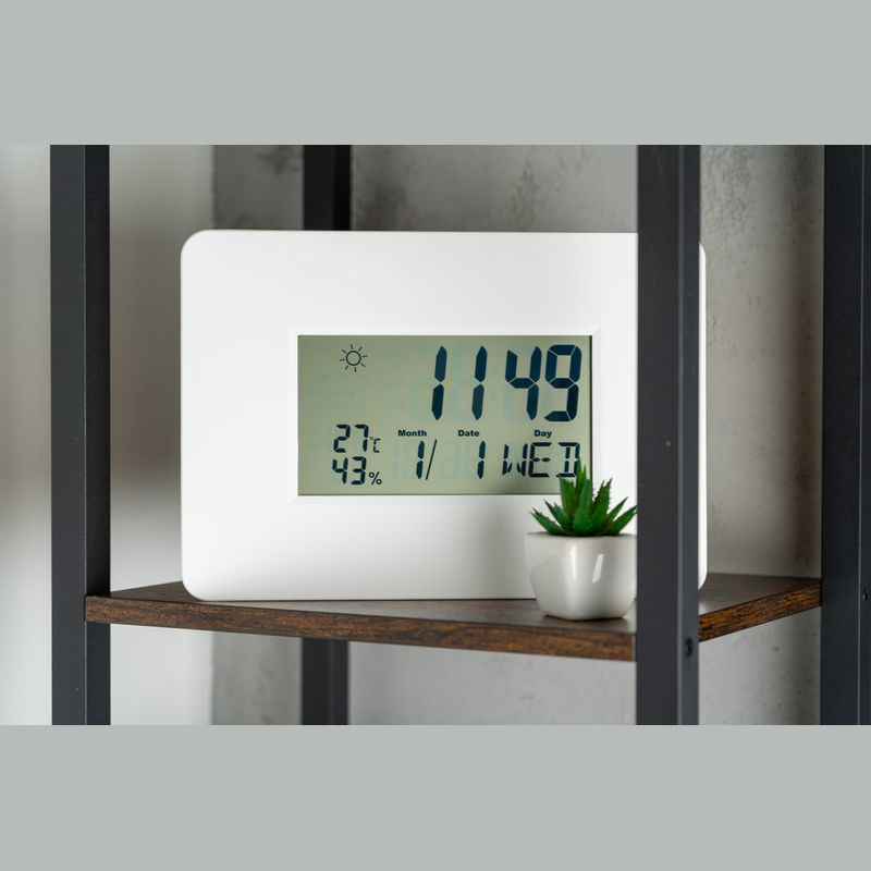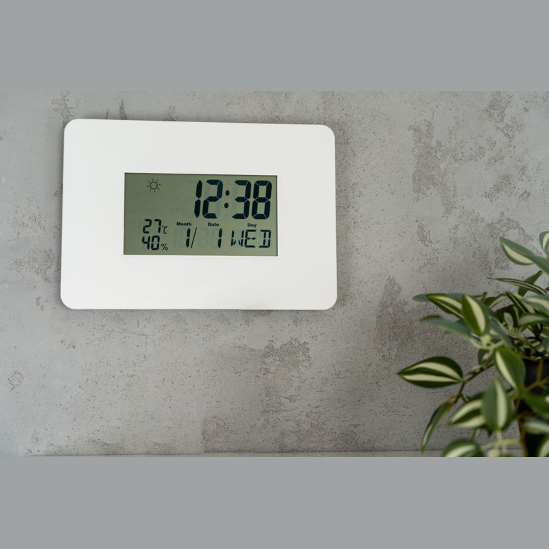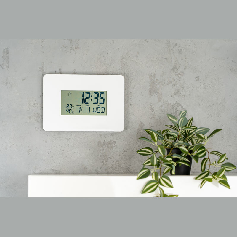 Digitale Wanduhr mit Kalender, Alarm und Schlummerfunktion, Thermometer und Hygrometer (automatische Aktualisierung der Werte alle 20 Sekunden) sowie einer Wetter-Anzeige. Ihre Werbung drucken wir unterhalb des Displays auf den Rand. Exklusive 2 AAA-Batterien, bestellen Sie diese gleich mit (Art. 999400).