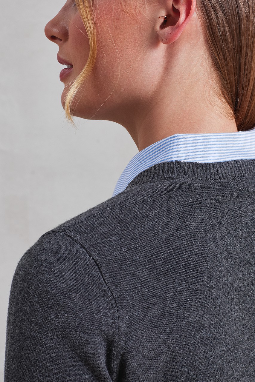Material 55% Baumwolle 45% Akryl 12 gg Strickartikel Merkmale Damenjacke mit hohem Baumwoll-Gehalt V-Ausschnitt-Modell Sieben-Knopf-Verschluss Rippstrick-Ärmelbündchen und -Saum Feinstrick-Artikel Pflegeleicht