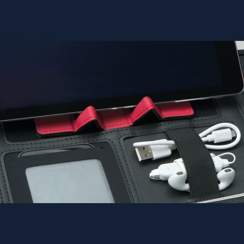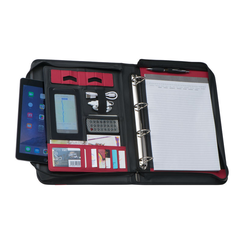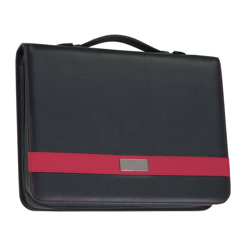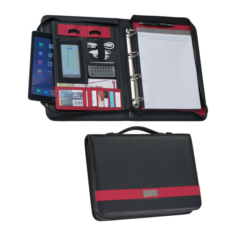A4 bonded leather briefcase featuring multiple compartments, a ring binder insert, a notepad with 60 lined pages, a tablet holder, a mobile phone pocket, a carrying handle, and a zip closure.