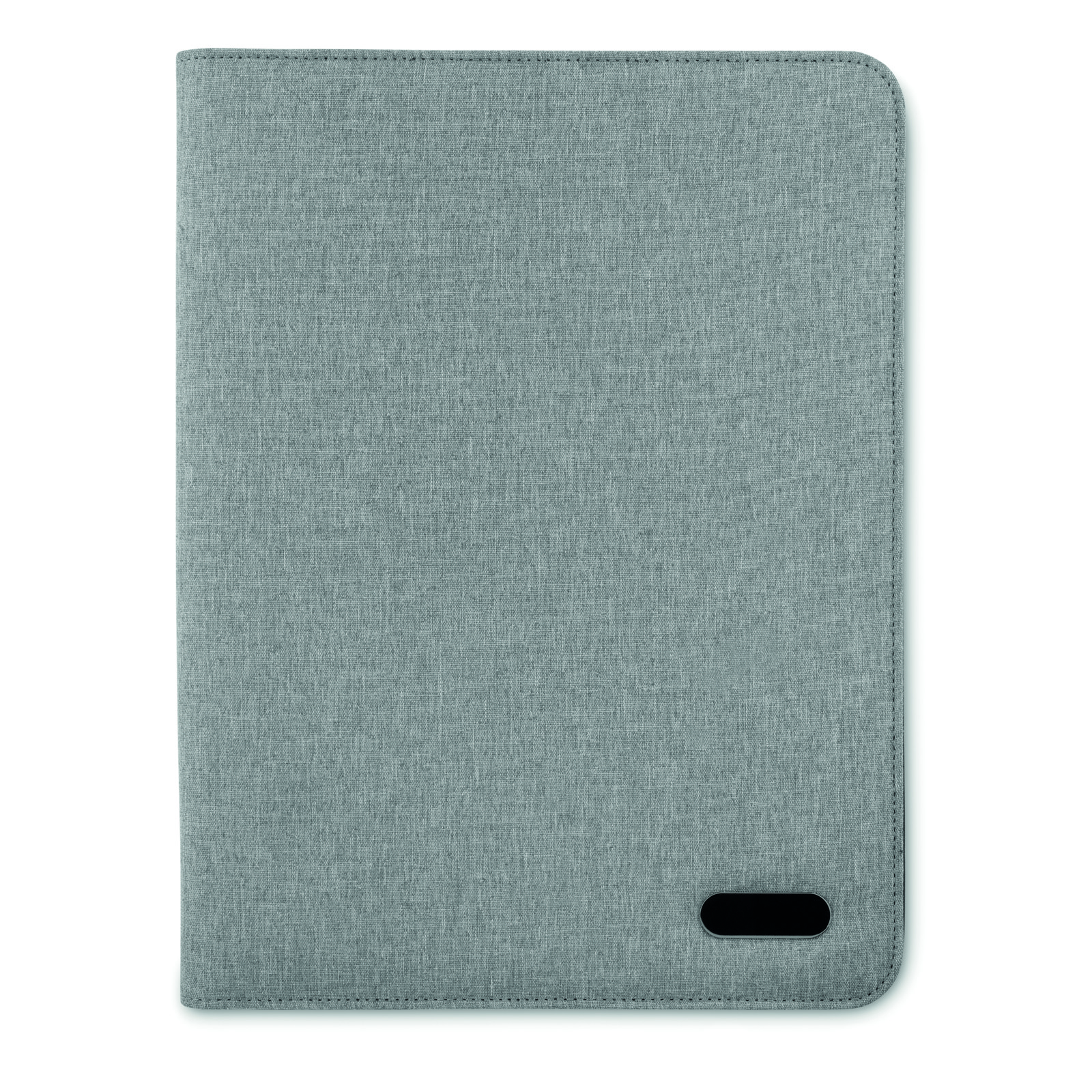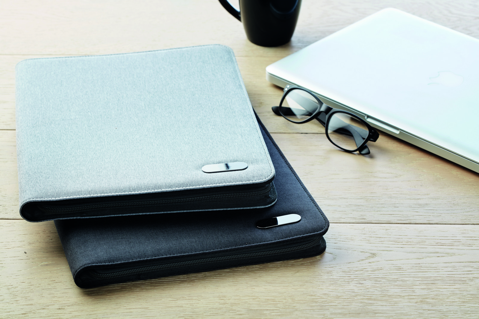 A4 conference folder in two-toned polyester. Zipped. 20 lined pages notepad. 3 compartments. Pen holder.