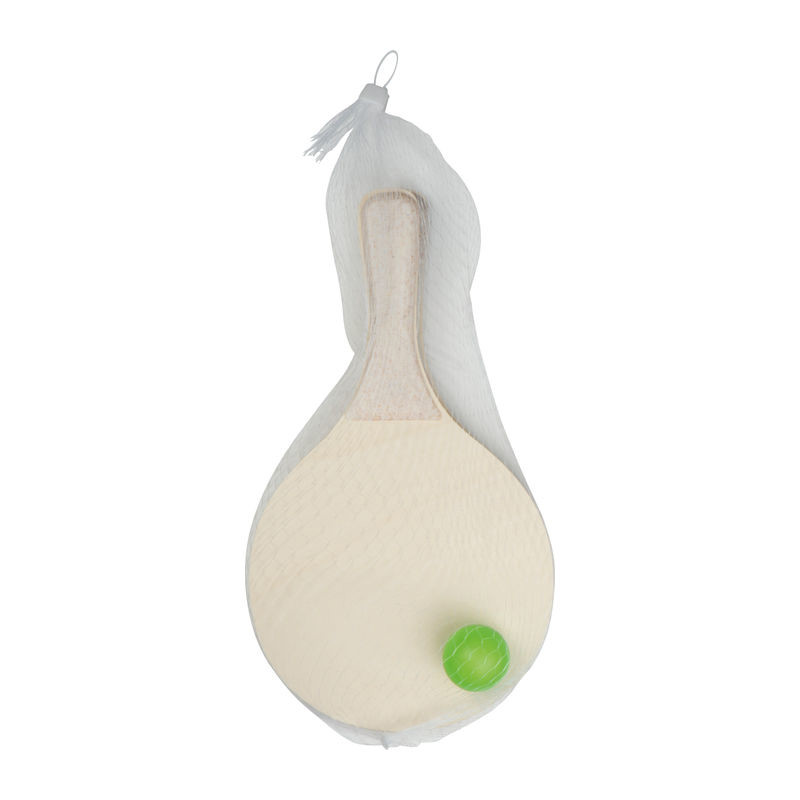Beach ball set presented in a net. The set comprises two wooden rackets with plastic handles and one ball.