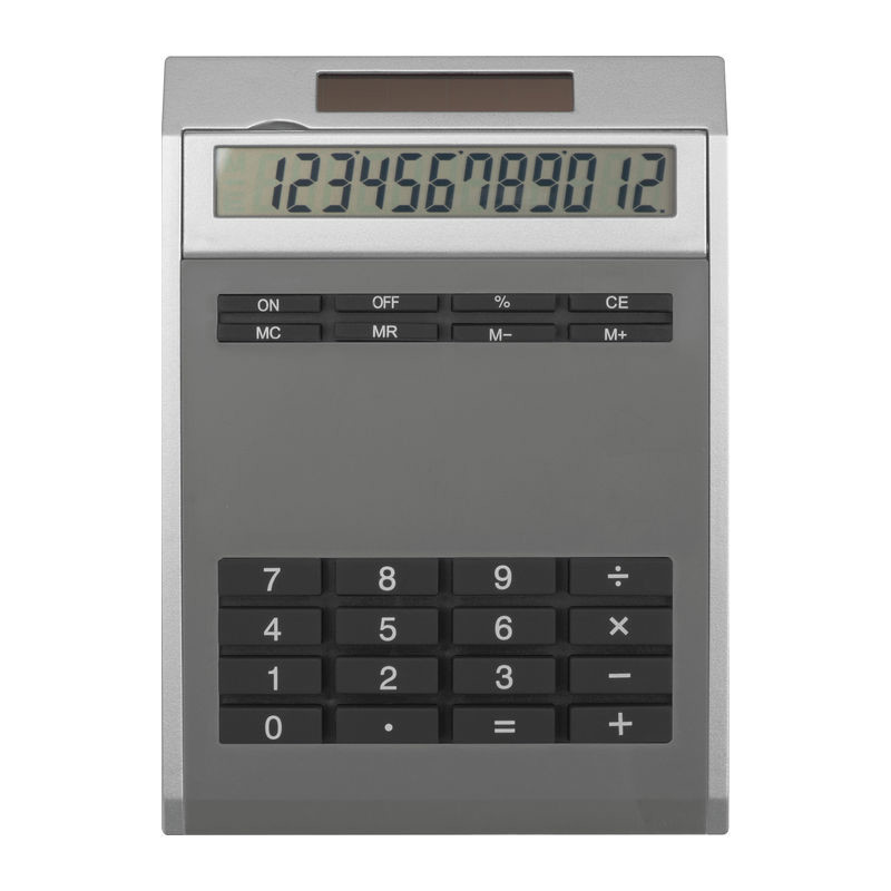 Elegant silver plastic calculator featuring 12 digits and dual power functionality, combining solar and battery energy sources.