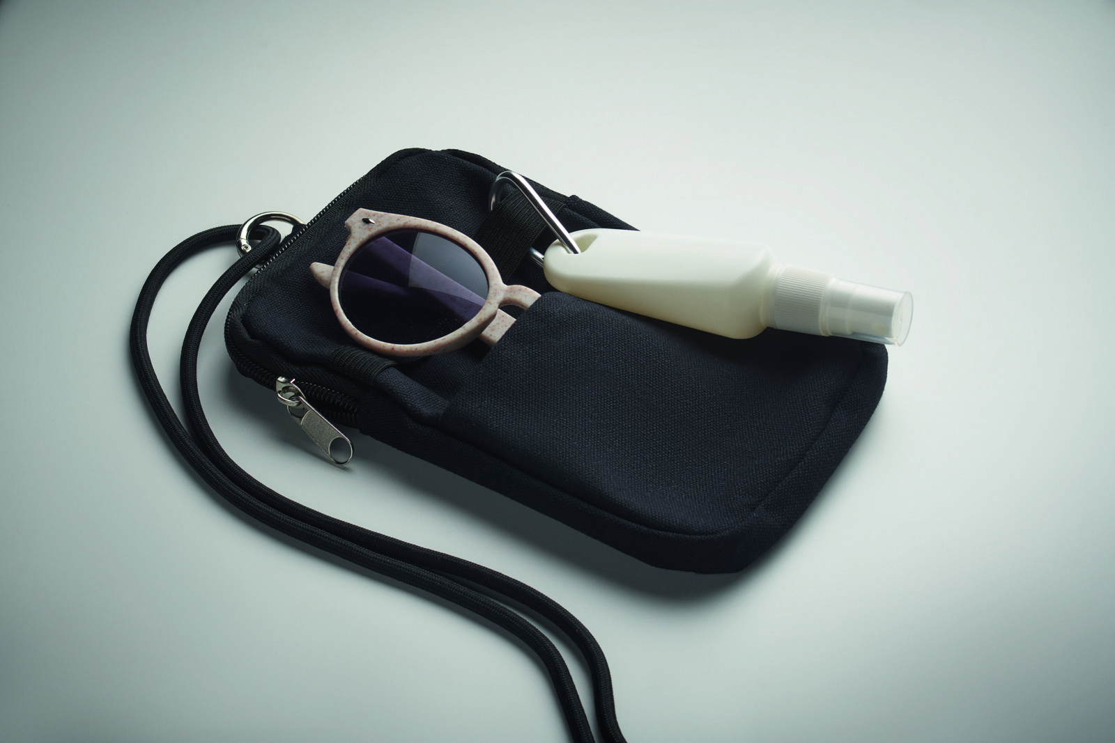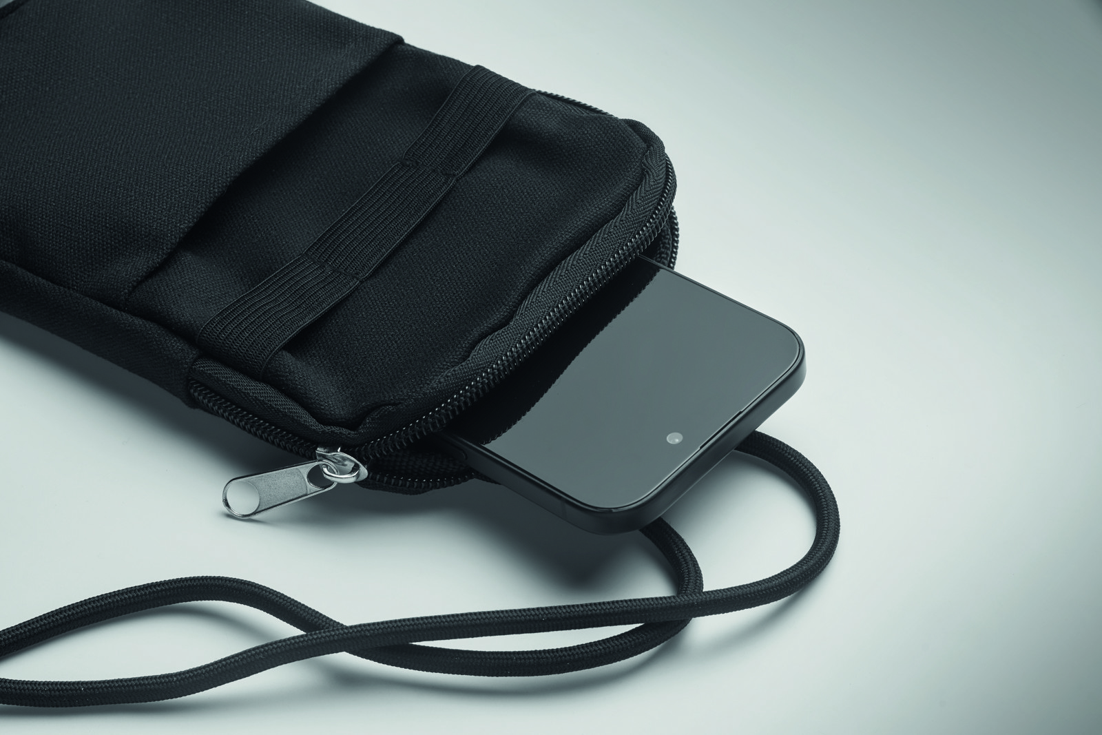 Cross body smartphone bag in recycled cotton with RPET polyester adjustable lanyard with open pocket on front side. 280 gr/m².
