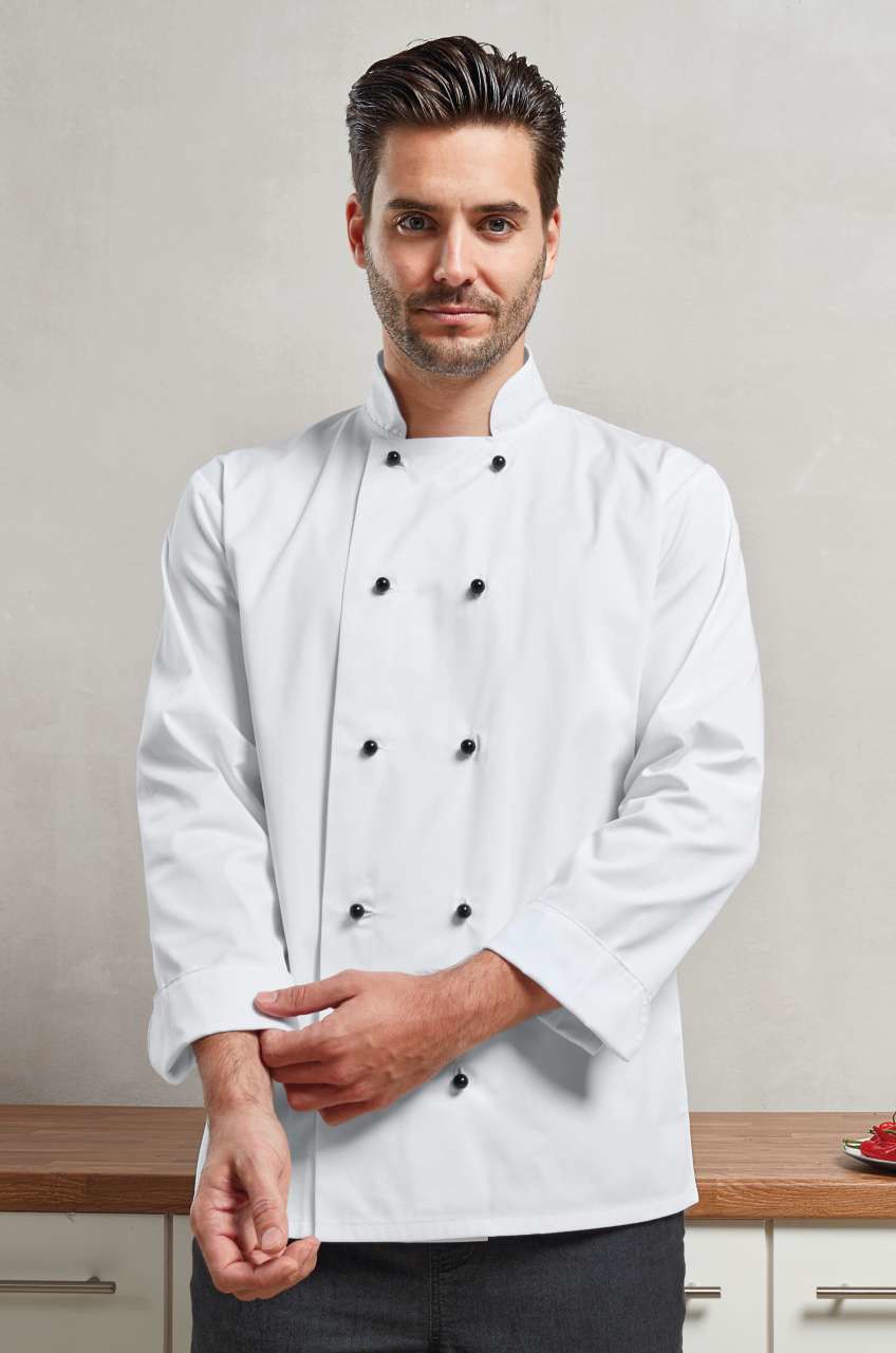 Fabric 65% Polyester, 35% Cotton Twill 195gsm Features Comes with Black removable studs Mandarin collar Ten hole wrap over fastening Turn back split cuff Easy care