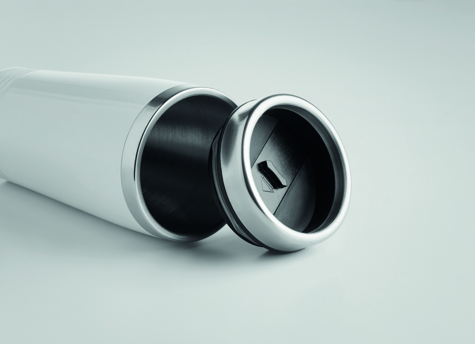 Double wall stainless steel travel cup with black PP lid. Capacity: 400 ml.