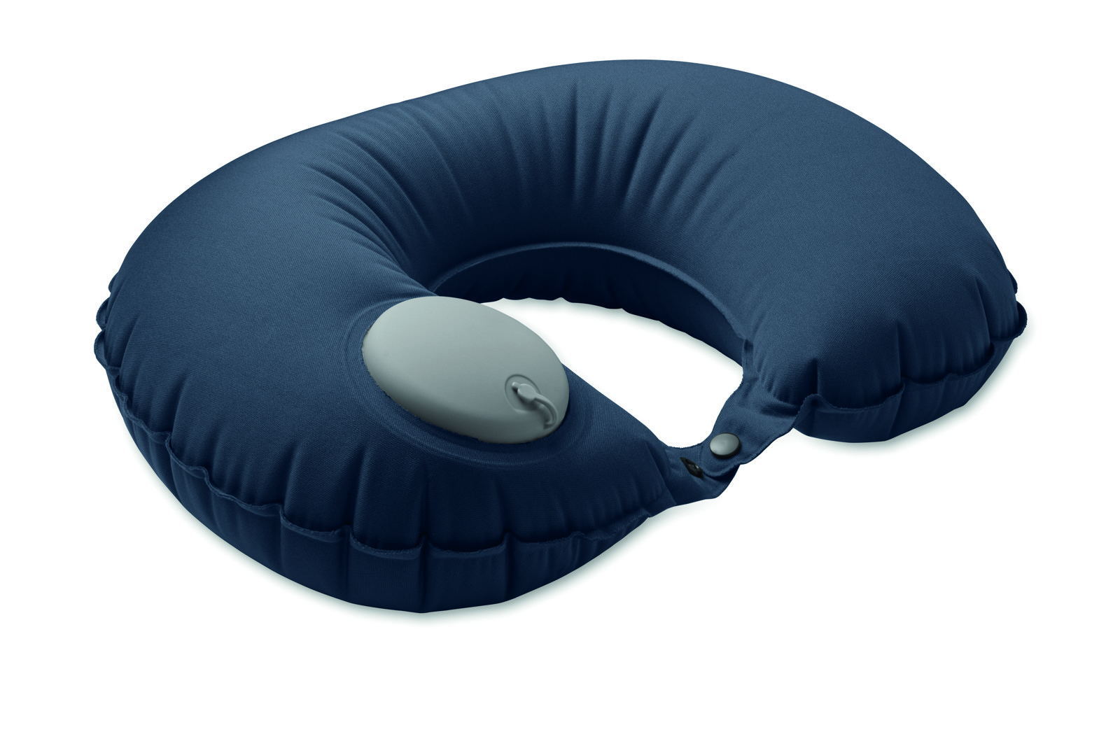 Fast inflatable pillow in milk silk fabric with built-in pump and release system. Pouch in self-material.