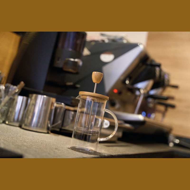 French press crafted from borosilicate glass featuring a press plunger, bamboo lid, and a capacity of 350 ml.