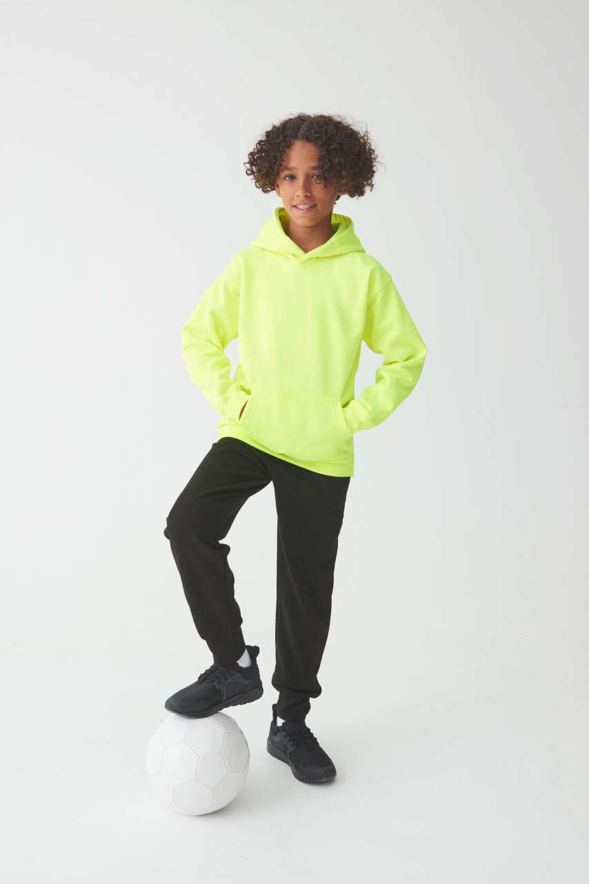 85% Polyester/15% Ringspun Cotton Standard fit Vibrant eye-catching colours No drawcords to comply EU regulation Brushed inner fleece Kangaroo pouch pocket Ribbed cuffs and hem Twin needle stitching detail Tear away label Double fabric hood