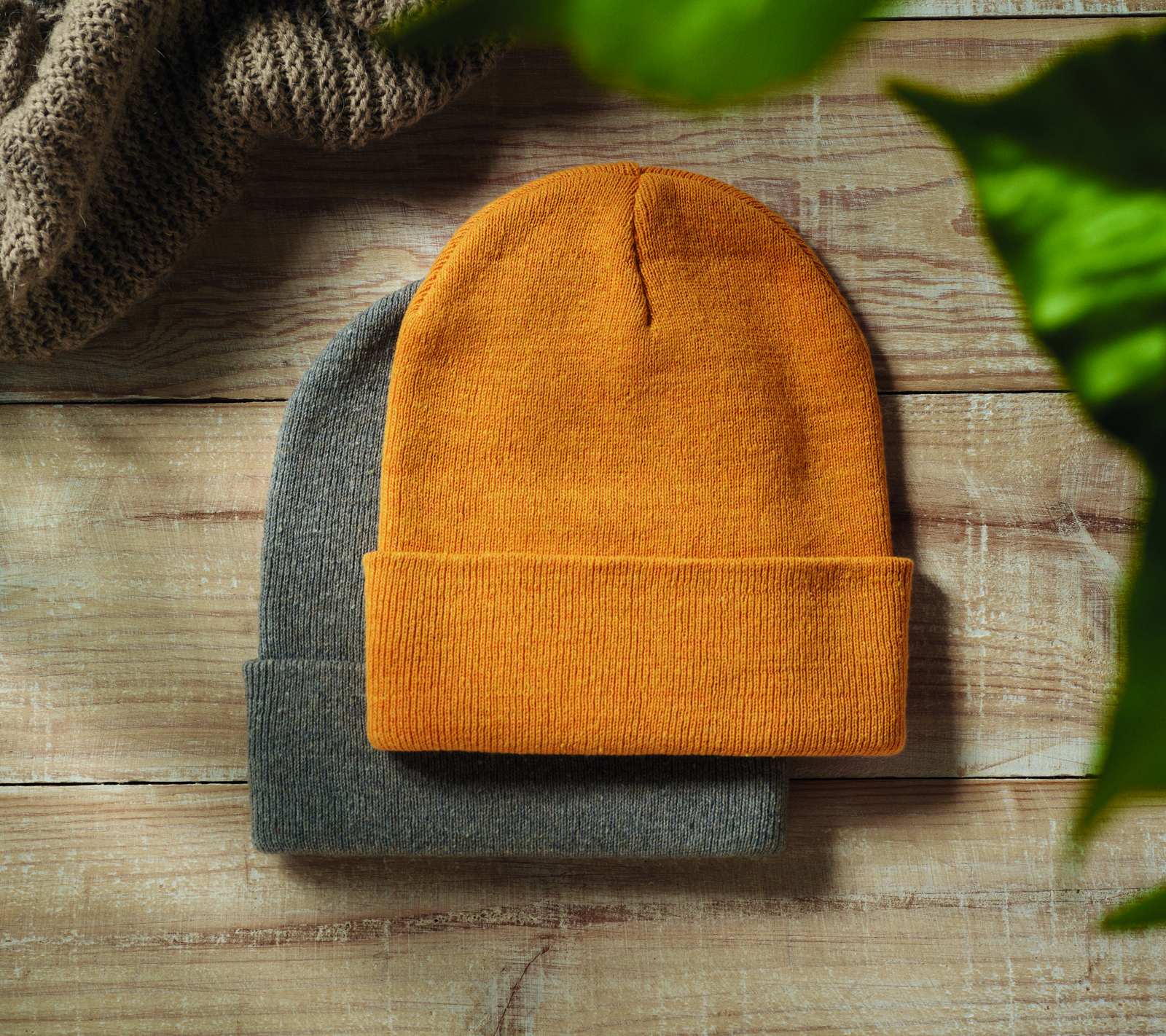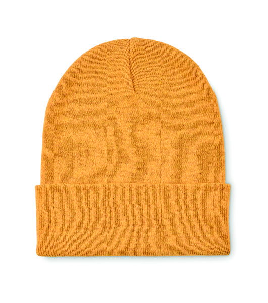 Unisex knitted beanie hat in soft stretchable polyester (64%) and acrylic (36%) with rolled up cuff. A stretchy one-size-fits-all design.