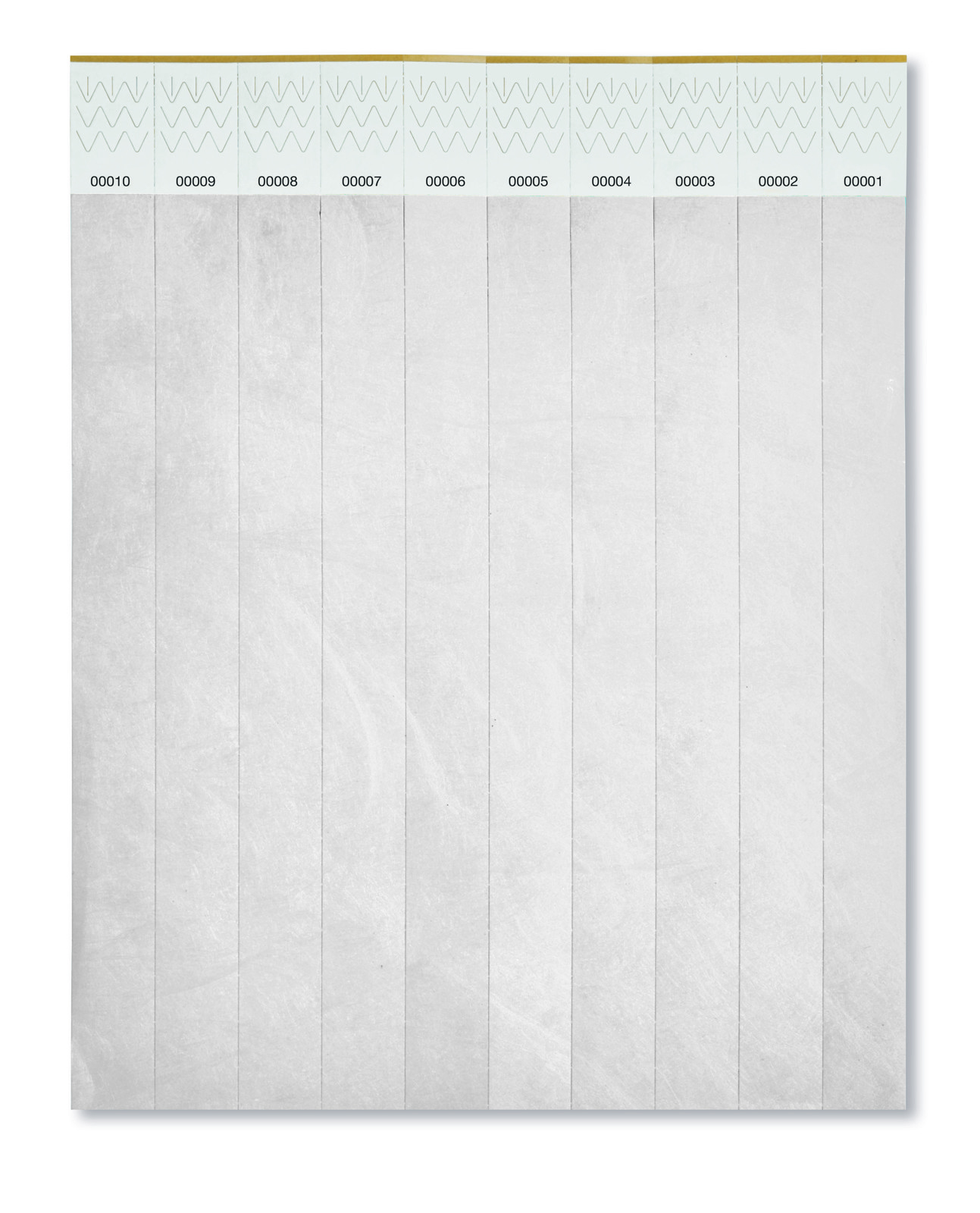 One sheet of 10 event wristbands. DuPont ™ Tyvek® 19mm wide. Including unique numbering on each wristband.