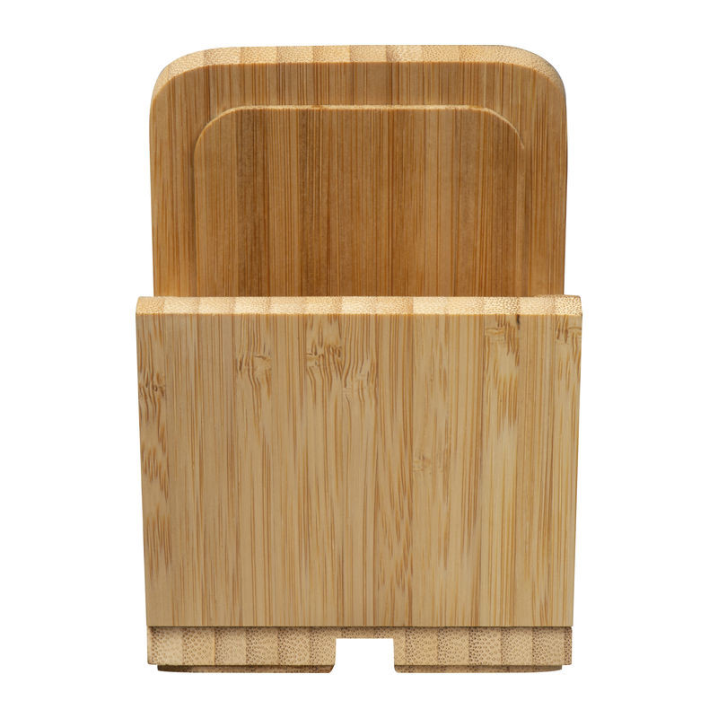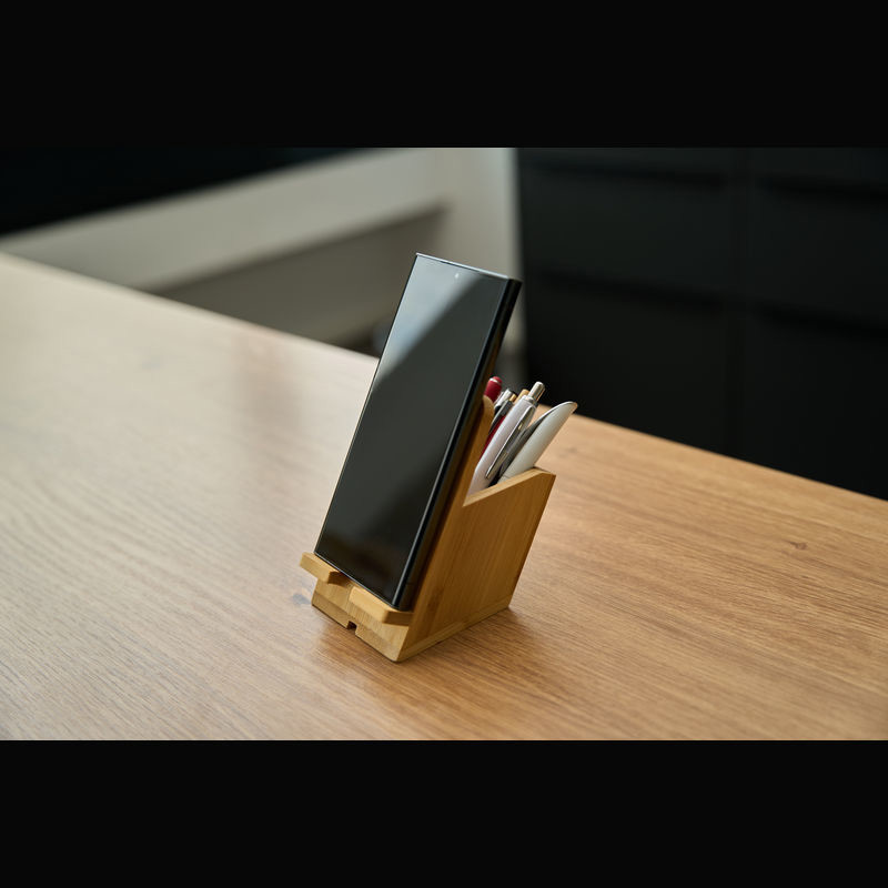 Bamboo pen and mobile phone holder featuring a cable tunnel, ensuring cables remain organised and unobtrusive. Each unit and engraving is unique due to the natural bamboo material.