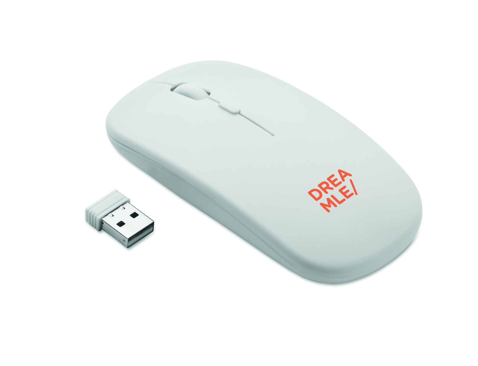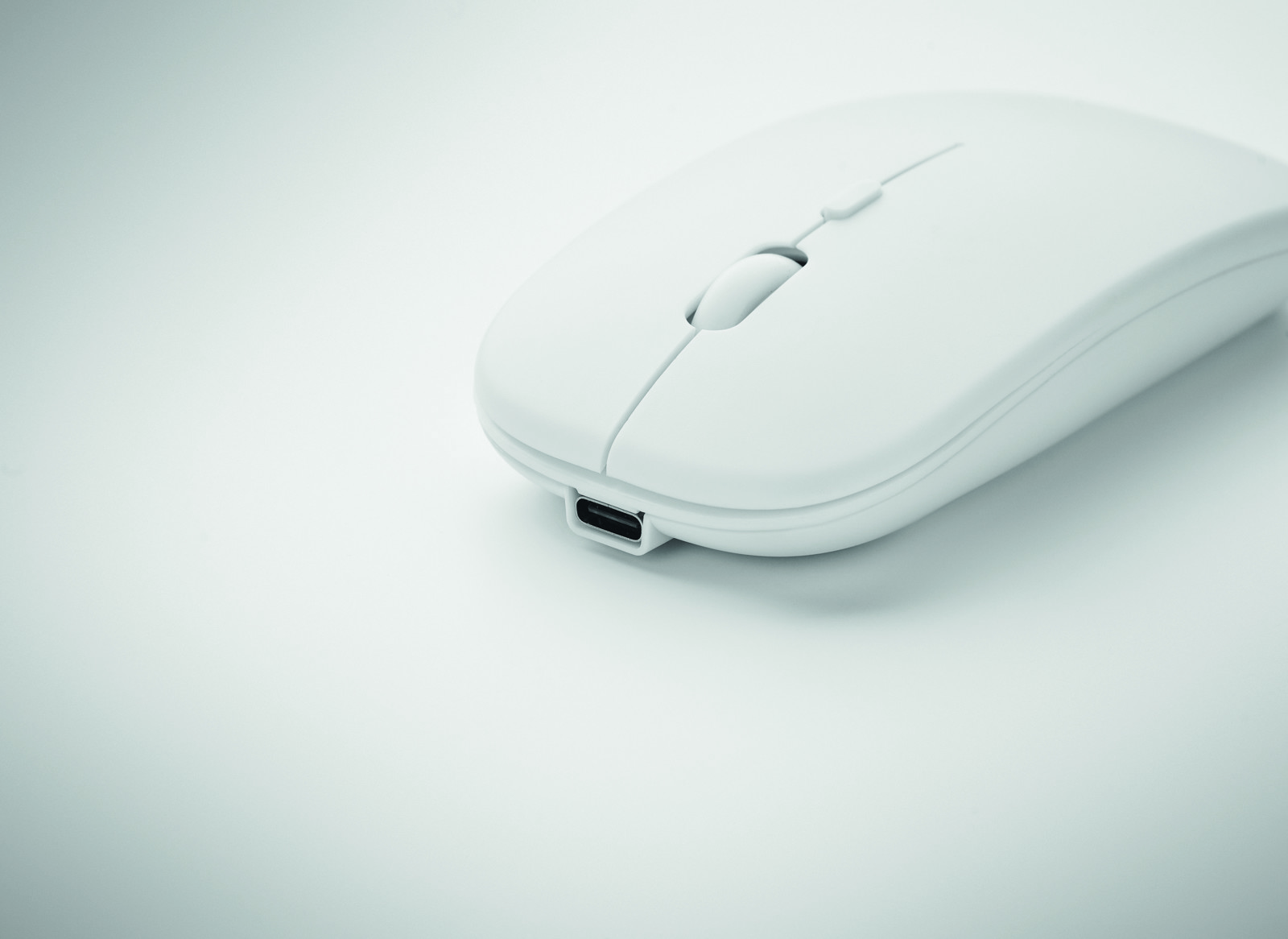 Wireless optical mouse in recycled ABS with USB rechargeable 500 mAh battery.