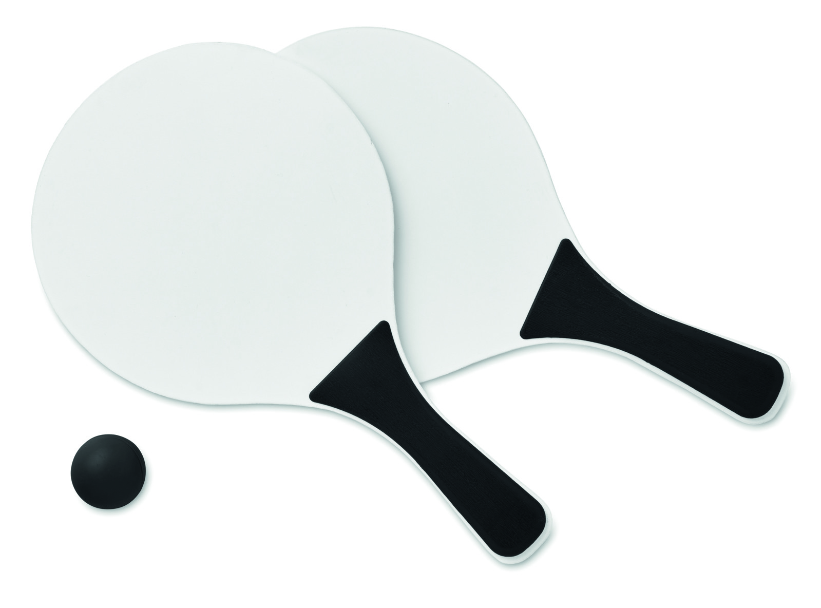 Small beach tennis set consisting of 2 MDF rackets and 1 soft ball.