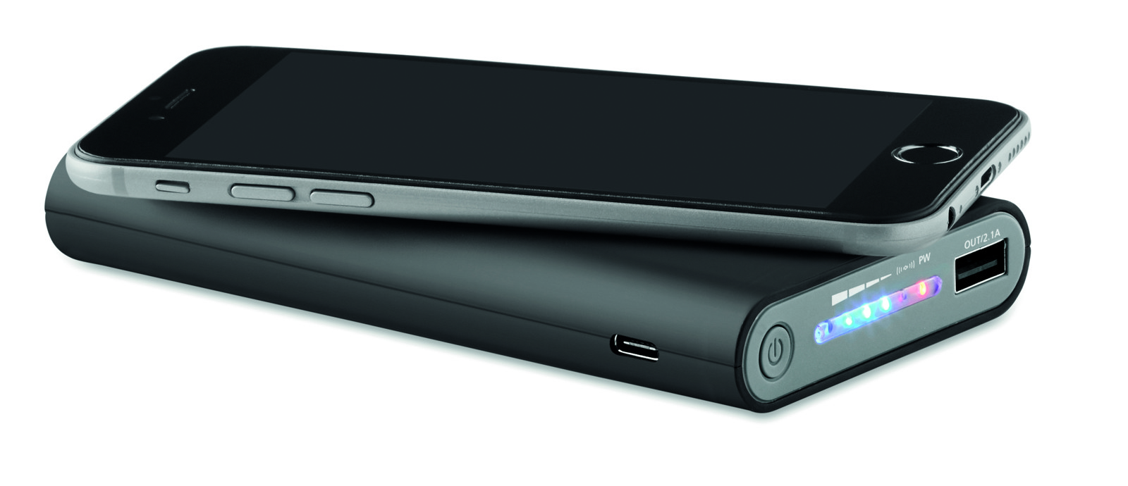 Wireless charging power bank with 8000 mAh capacity. Power bank can be charge by cable or wireless charging. Includes Type C connector. Powerbank output DC5V/2.1A. Wireless output: DC5V/1A. Wireless receiving: DC5V/0.75A Compatible latest androids, iPhone® 8, X and newer.
