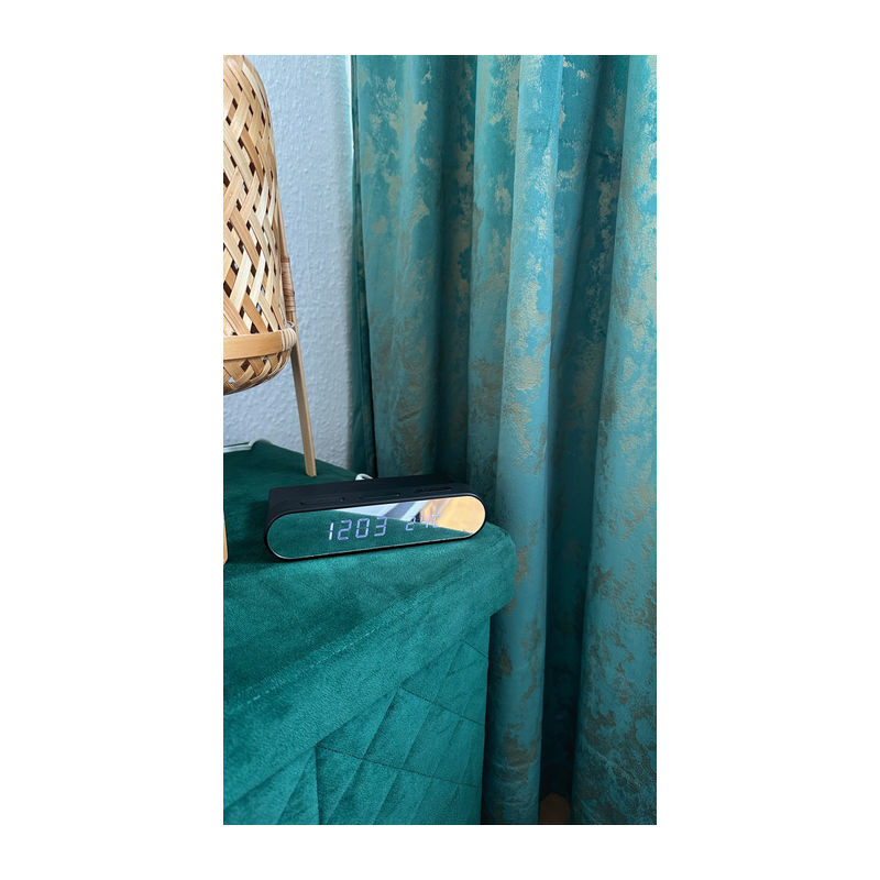 Alarm clock featuring a mirrored display and integrated wireless charging capability. The clock offers time display in 12-hour or 24-hour format, date indication, alarm function, and temperature display in Celsius or Fahrenheit. Supplied with a USB-A to USB-C charging cable.