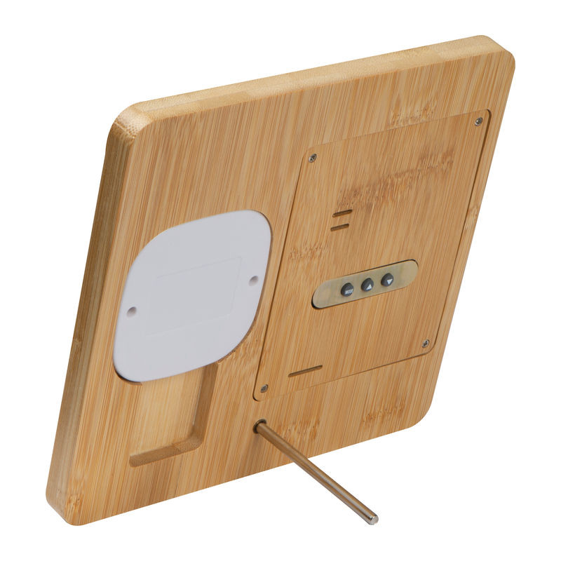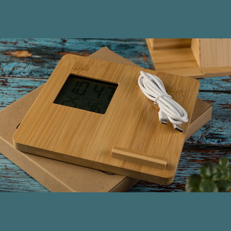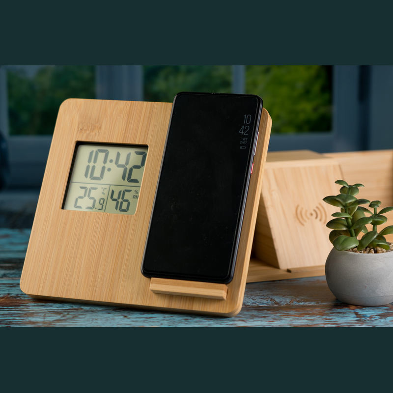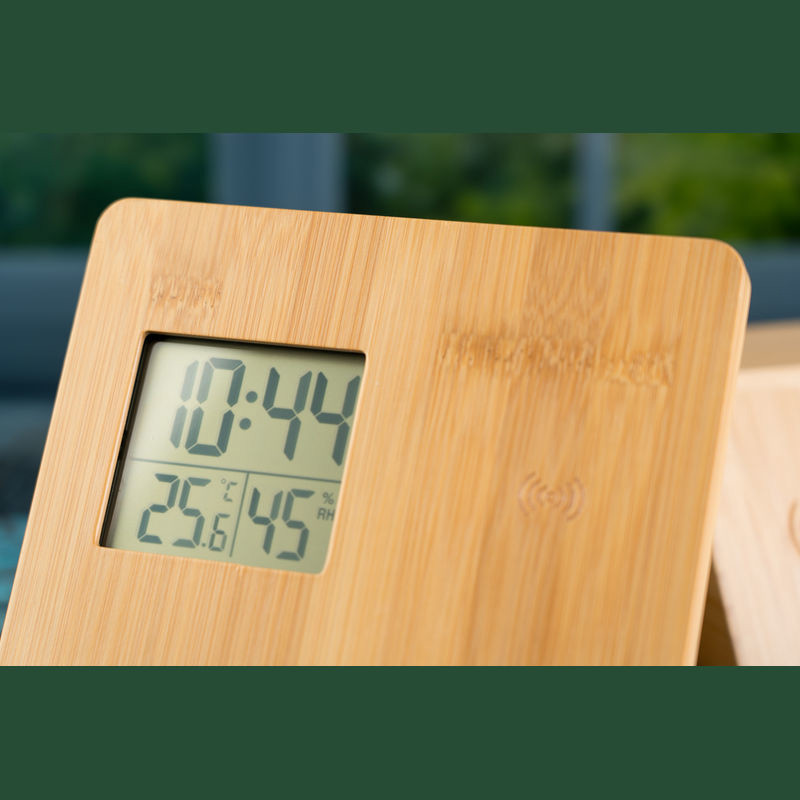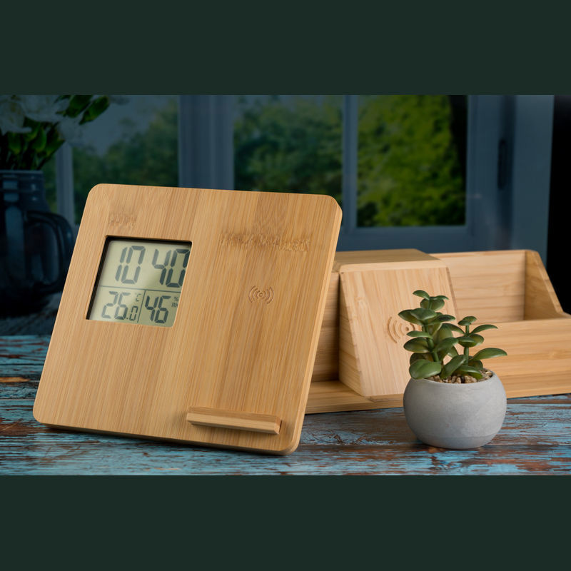 Bambusova meteorološka stanica / bežični punjač s digitalnim zaslonom koji prikazuje temperaturu, vlažnost i vrijeme. Pruža stabilno postolje. Vaš logotip bit će ugraviran na prednjoj strani.