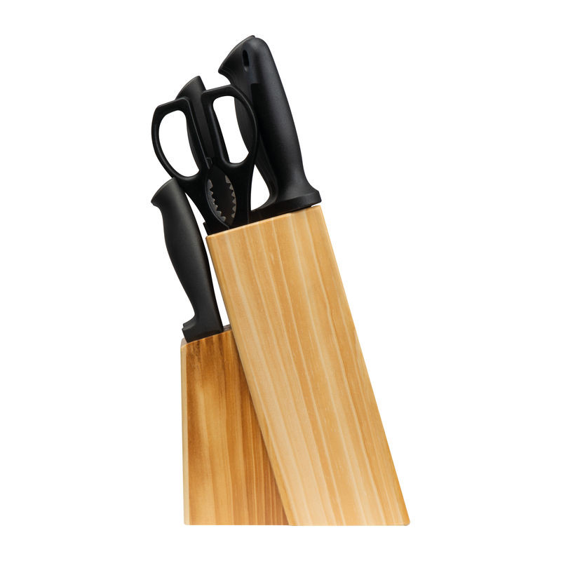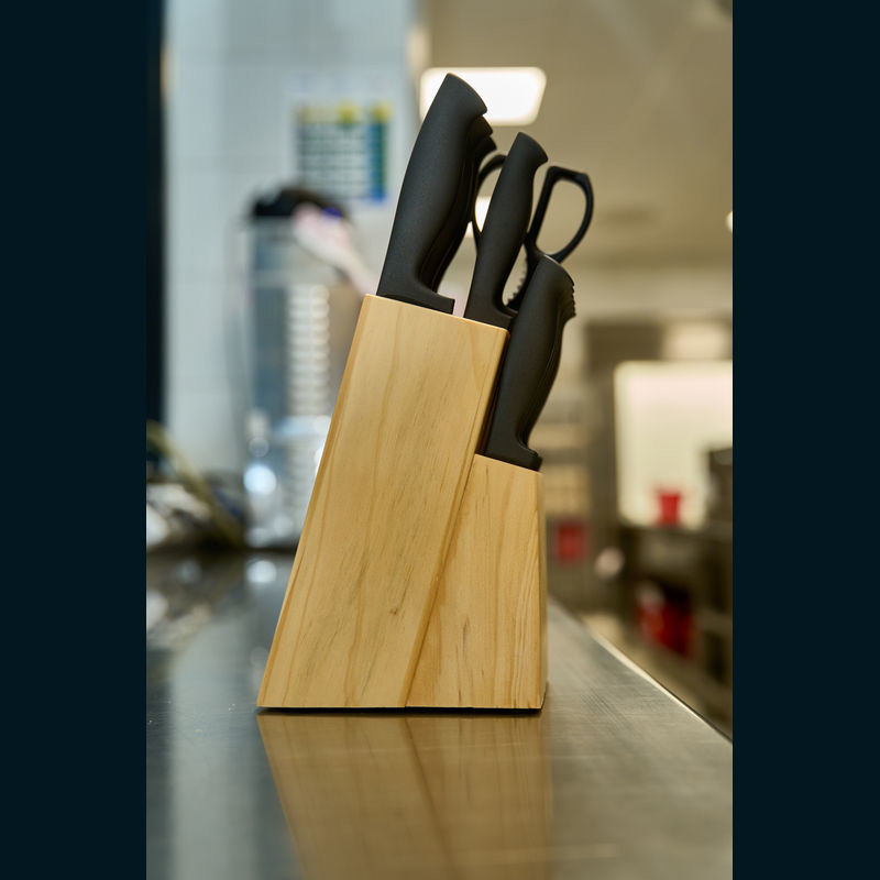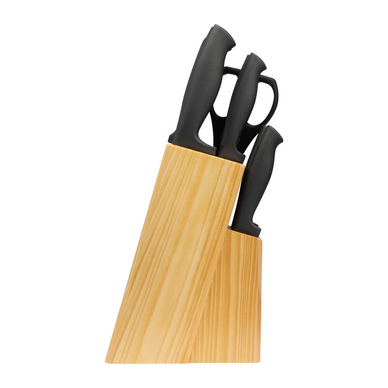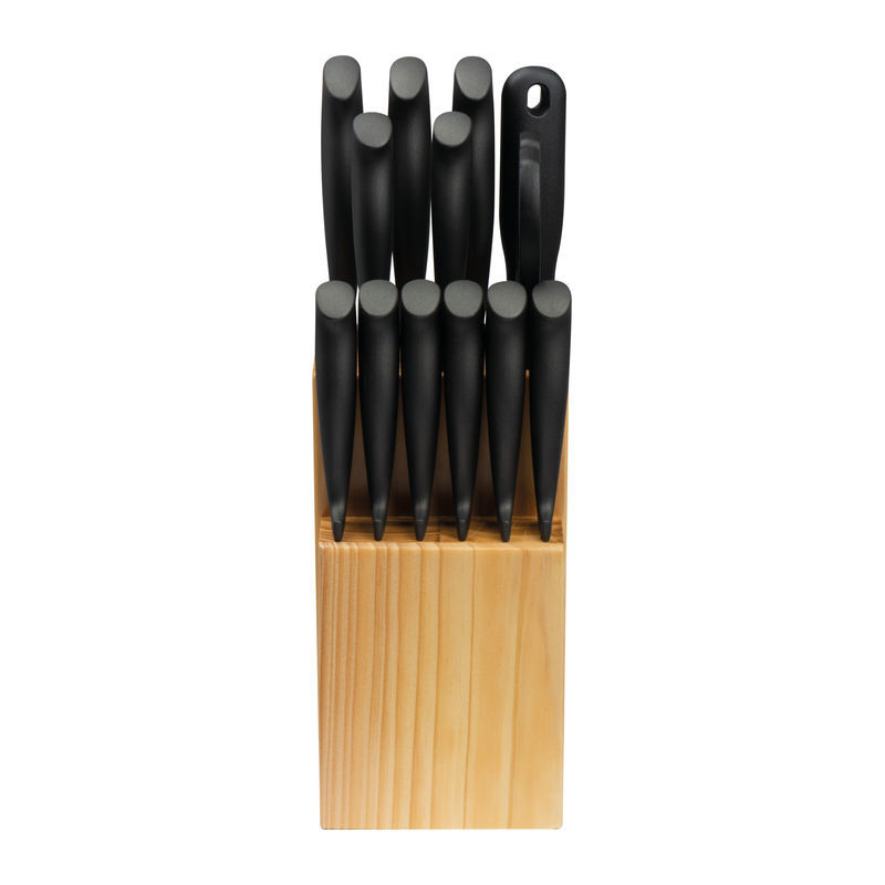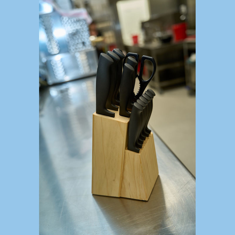 Set od 14 noževa u bloku s oštricama obloženim titanom i čvrstim držačem od drva (bor). Savršen dodatak za svaku dobro opremljenu kuhinju i izvrsna platforma za vaš logotip. Graviramo ga na blok za noževe.