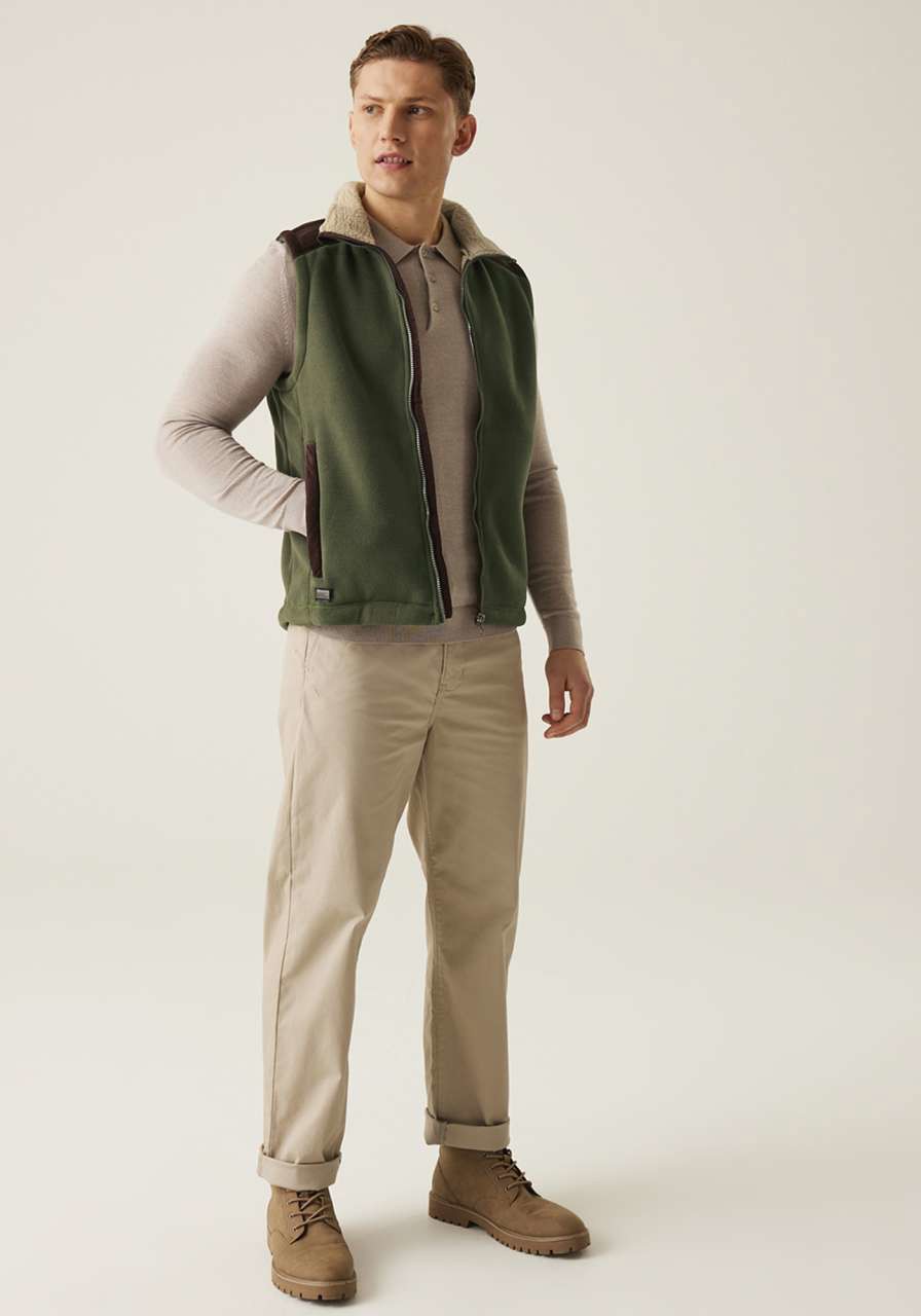 Fabric Information 440gsm sherpa backed polyester microfleece Corduroy shoulder and elbow overlay panels Special Features Centre front full zip 2 lower zipped pockets
