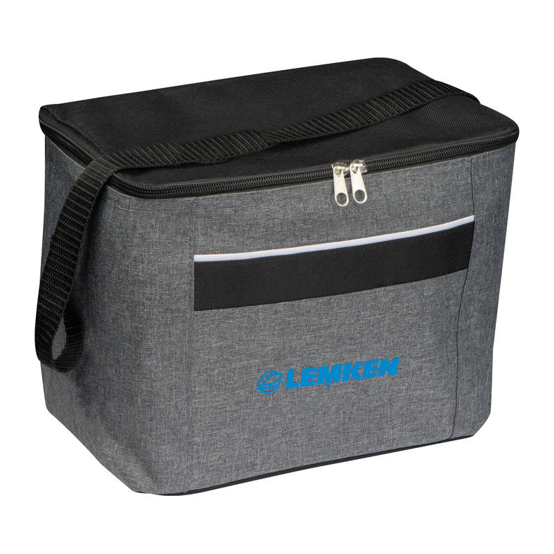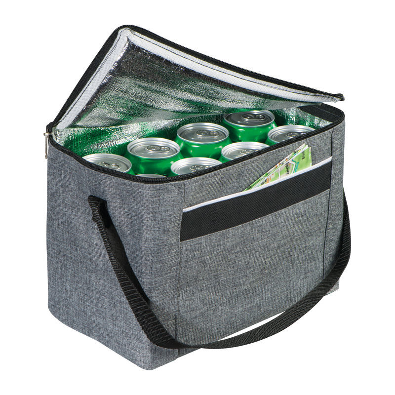 Hladnja torba od poliestera 300D+600D s ručkom za nošenje, zatvaračem na patentni zatvarač, prostorom za šest limenki ili boca od 500 ml i prednjim odjeljkom s vašim logotipom.