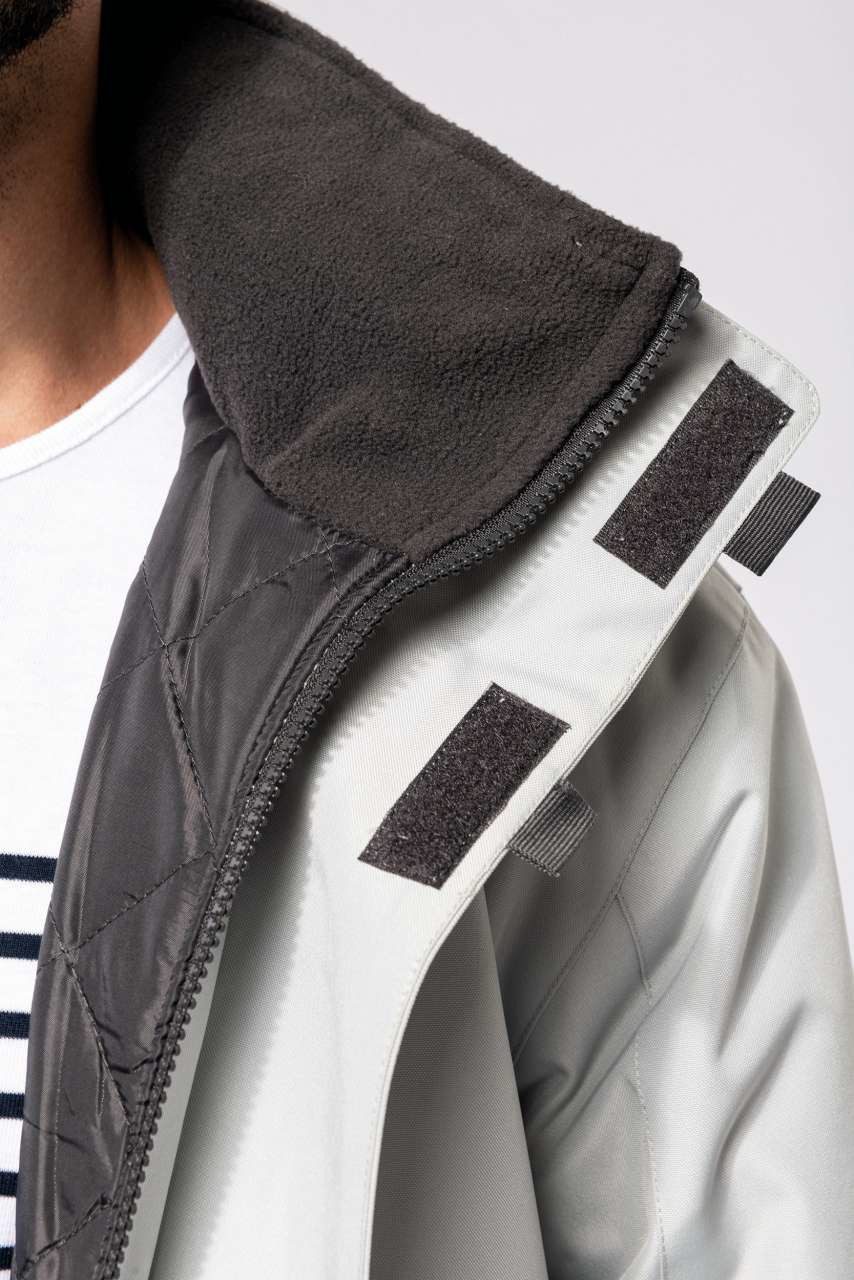 Vanjski dio od 100 % poliestera oxford – prošivena poliesterska ispuna i podstava Zatvaranje patentnim zatvaračem s čičkom i skrivenim gumbima na pritisak 2 vanjska džepa sa zatvaračem 2 unutarnja džepa (1 džep za mobilni telefon) Skrivena kapuljača Ovratnik podstavljen flisom Pristup za dodavanje ukrasa s pomoću zatvarača
